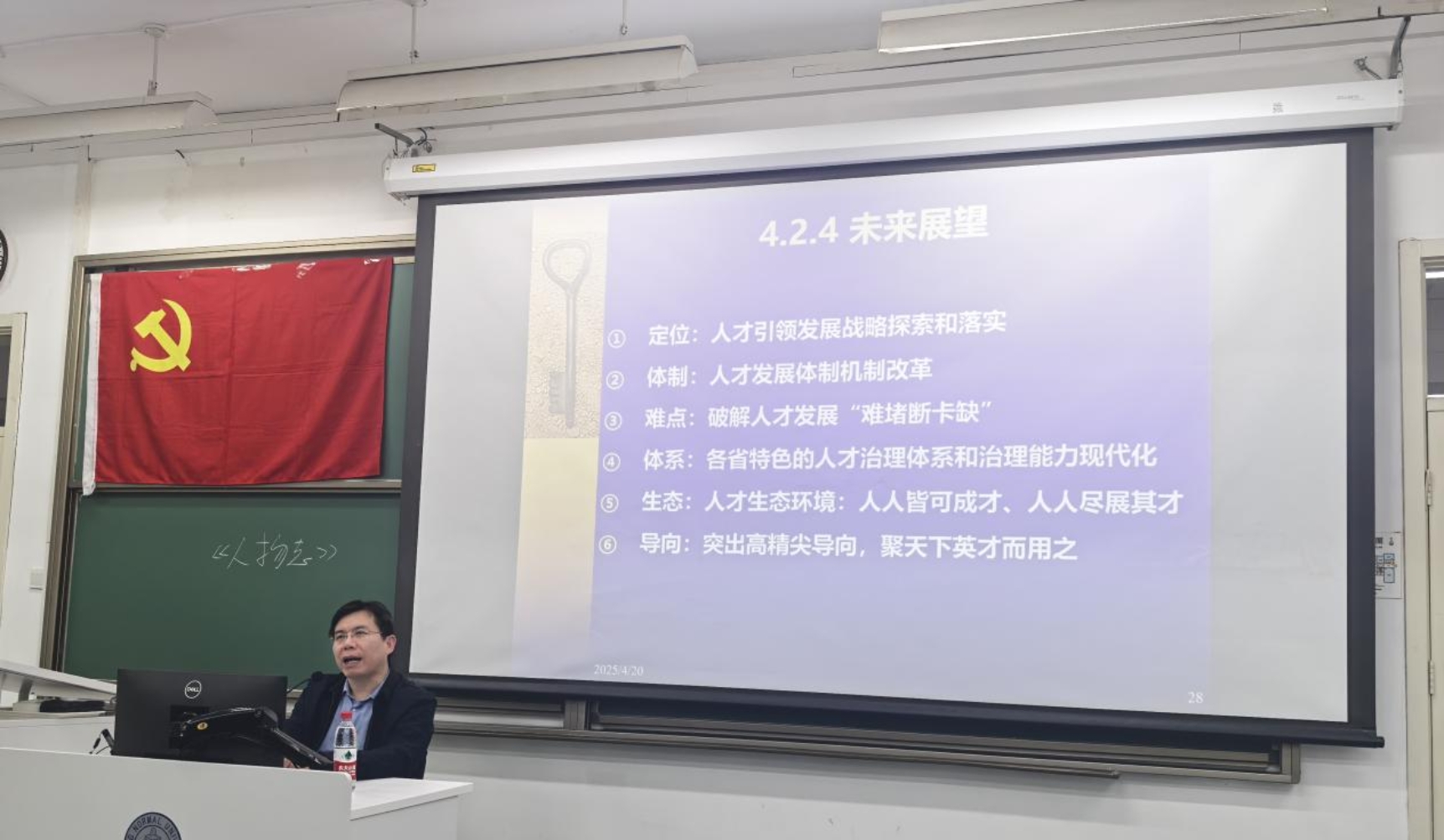 讲座伊始,于海波教授从人才的含义出发,对2025年政府工作报告、党的二十届三中全会、北京市实施意见中的相关论述进行了具体解读。他强调,要全面提高人才队伍质量,人才评价与人才发展是核心。