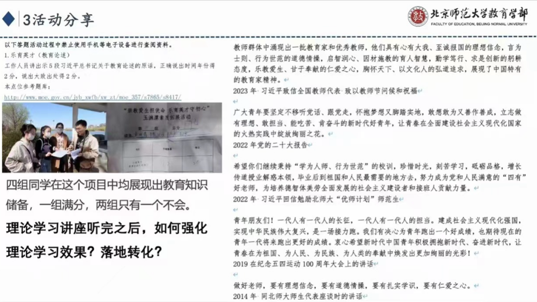 活动首先学习了习近平总书记在全国教育大会上的重要讲话精神,大会讲话全面总结了新时代教育事业取得的历史性成就、发生的格局性变化,系统阐释了教育强国的科学内涵和基本路径,深刻阐述了教育强国建设要正确处理好的重大关系,系统部署了全面推进教育强国建设的战略任务和重大举措。支部还结合党的二十届三中全会精神、习近平总书记“四有”好老师重要讲话精神和给公司“优师计划”师范生重要回信精神,学习贯彻大会精神。随后,活动邀请了教育学部2023级硕士研究生、第九党支部李赓欣同志分享该支部在参与教育强国建设、红色“1+1”支部共建活动的好经验好做法。支部将深入学习贯彻全国教育大会精神,学习其他支部好经验好做法,巩固落实立德树人根本任务的一线阵地,打造参与推动义务教育均衡充分的先锋队,成为服务北京经济社会发展的青春力量,建设支持支部同志全面发展的温馨之家。