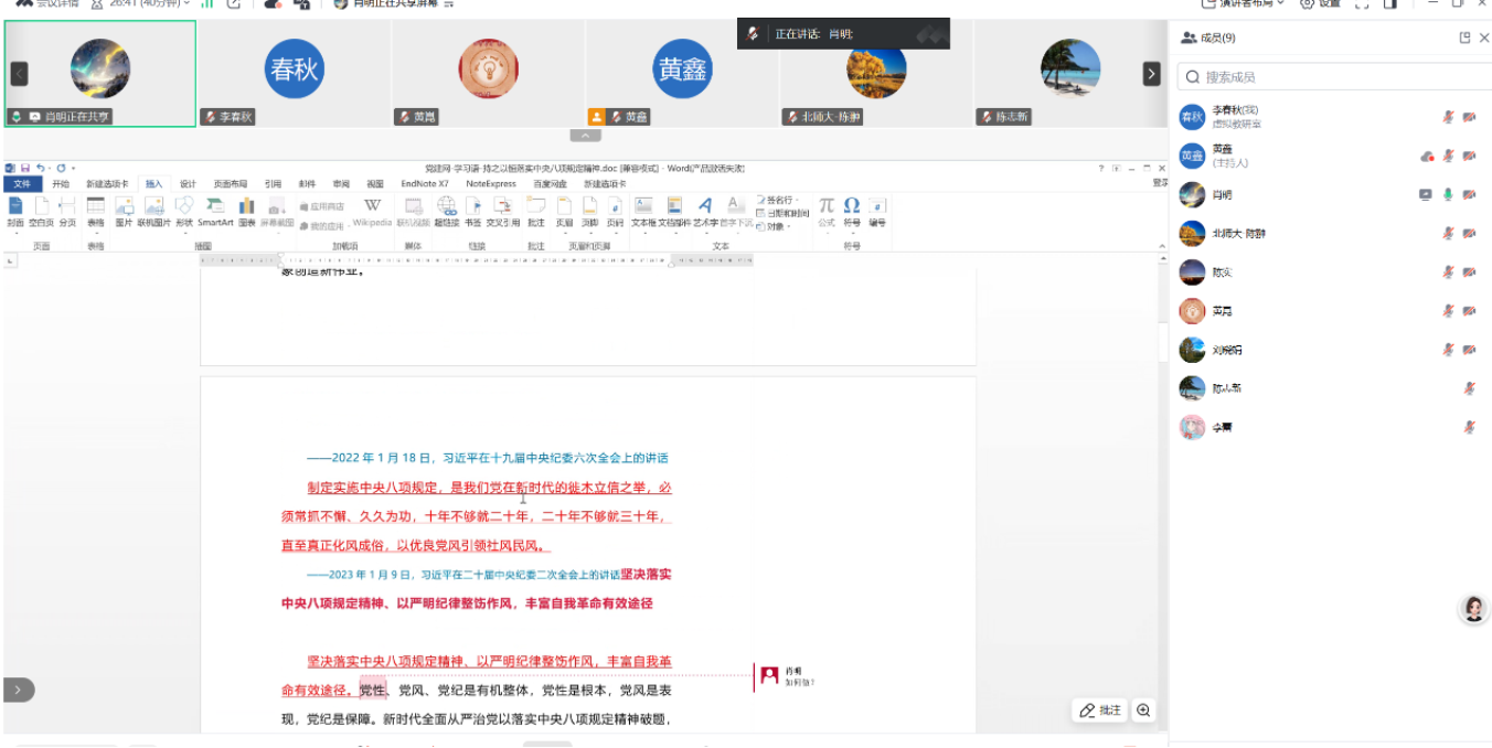 最后,肖老师领学了党建网刊发的《持之以恒落实中央八项规定精神》一文的内容要点,分享了个人读书笔记,强调了学习和践行中央八项规定精神的重要性,并对下一步工作进行了安排。肖老师强调,中央八项规定精神是新时代加强党的作风建设的重要遵循,是党员必须严格遵守的行为准则。为此,教工二支部将遵照党中央的部署和安排,持续加强作风建设:一是提高政治站位,深化思想认识,把学习贯彻中央八项规定精神作为捍卫“两个确立”、做到“两个维护”的具体行动,不断增强作风建设的自觉性和坚定性。二是坚持问题导向,狠抓整改落实,聚焦形式主义、突出问题,要把自己摆进去,要在检视反思中剖析根源、改进提高,以钉钉子精神推动作风建设常态化和长效化。三是强化责任担当,做到学用结合,将中央八项规定精神贯穿到工作落实的全过程,以优良作风推动支部各项工作再上新台阶。
