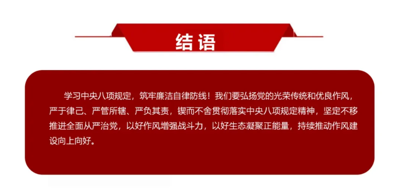党的十八大以来,党中央高度重视作风建设,深刻认识到作风问题关系重大。在此背景下,2012年中央八项规定应运而生,旨在解决党内突出问题,推动全面从严治党。中央八项规定涵盖改进调查研究、精简会议活动等八个方面,黄老师从背景、意义、实践等方面对中央八项规定精神进行了深入讲解,她通过详实的历史数据和鲜活的案例分析,让党员们直观感受到深入学习贯彻中央八项规定精神的重要性,还结合教育领域的真实案例,提醒大家避免违反八项规定。同时,黄老师还提出践行要求,强调要从自身和小事做起,激励所有党员增强担当力、执行力与廉洁力,在教学、科研、服务中发挥先锋模范作用。