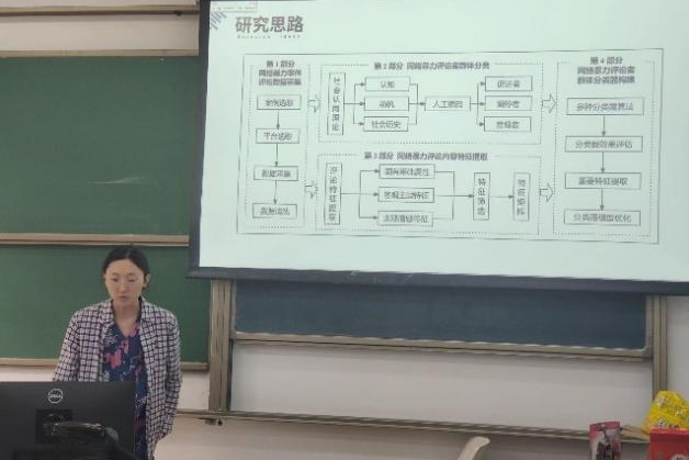 代歆然同学分享了《网络暴力评论者的身份识别》,介绍了网络暴力评论者研究的重要现实意义,介绍了通过网络评论数据爬取、分类模型构建、实证检验等研究过程,提出了群体引导策略。