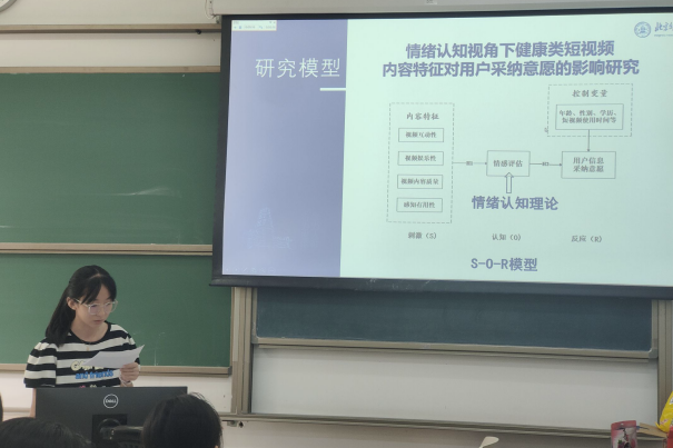 焦楷媛同学分享了《情绪认知视角下健康类短视频内容特征对用户采纳意愿的影响研究》,她根据S-O-R模型,构建并检验了短视频内容特征、用户情绪、用户信息采纳意愿三者间的关系。