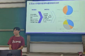其中,闫鸿宇同学分享了《河北大学图书馆学科服务现状分析》,他向同学们介绍,他以河北大学图书馆的学科服务现状为主要研究选题,通过问卷调查的方法,探讨其现状、分析其服务效果,为图书馆进一步提升服务质量提供依据,并通过柱状图、饼图等方式直观地展示了分析结果。