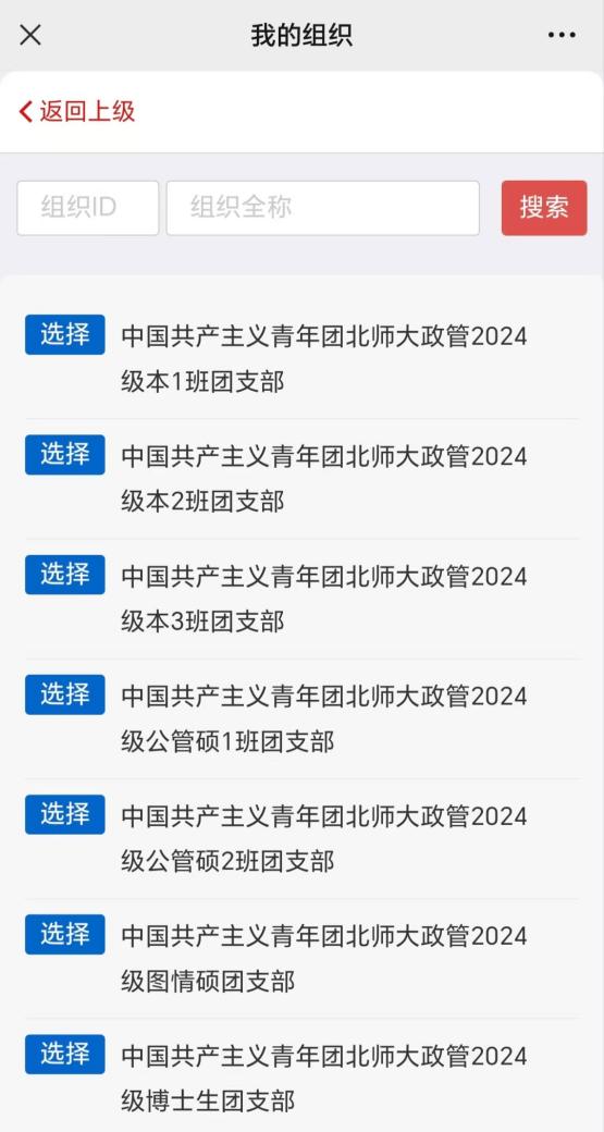 4.在【组织全称】处输入“中国共产主义青年团北师大政管2024级”后点击【搜索】