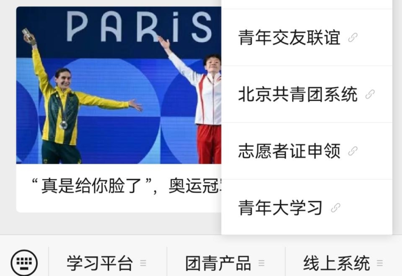 1.搜索【青春北京】公众号,在公众号内部点击右下角处【线上系统】,再点击【北京共青团系统】