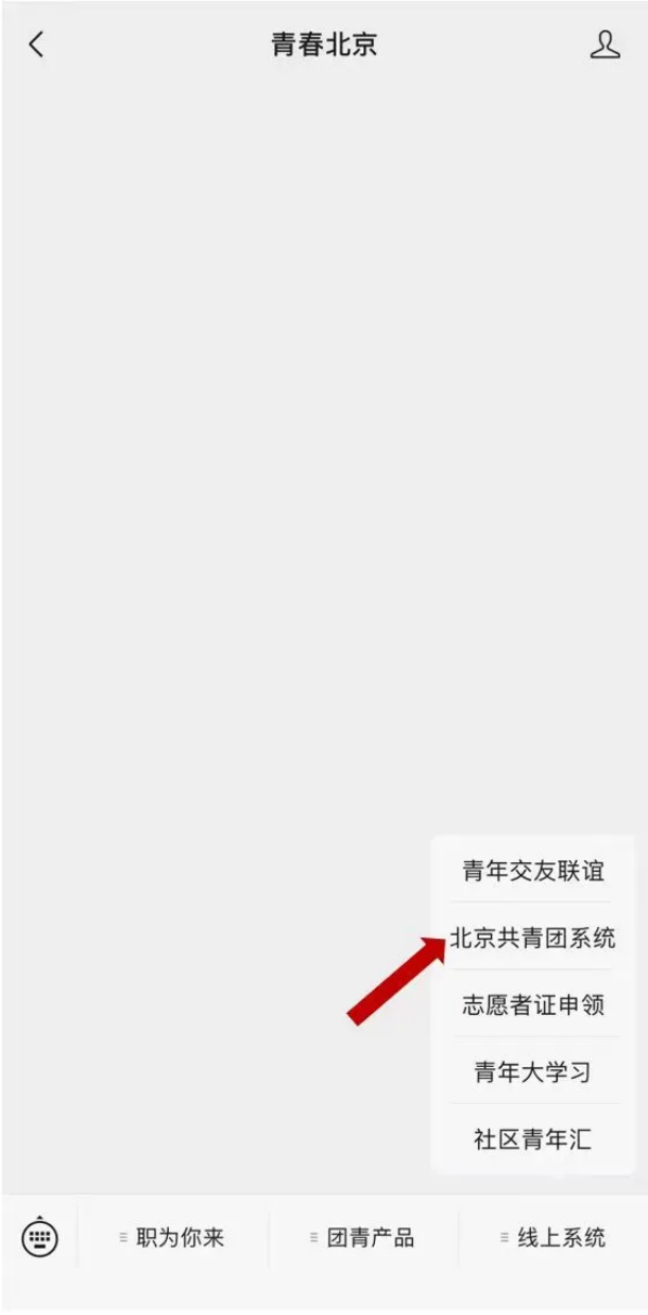 (1)关注北京共青团官方微信公众号“青春北京”,点击右下方菜单栏“线上系统”中的“北京共青团系统”。