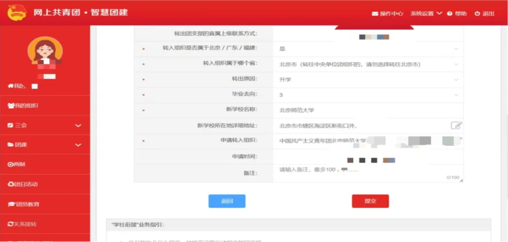 2.进入智慧团建后,点击左侧最下方的“关系转接”,进入页面后,按照要求选好具体内容最后提交信息即可(“转入团组织属于哪个省”处选择“北京”)