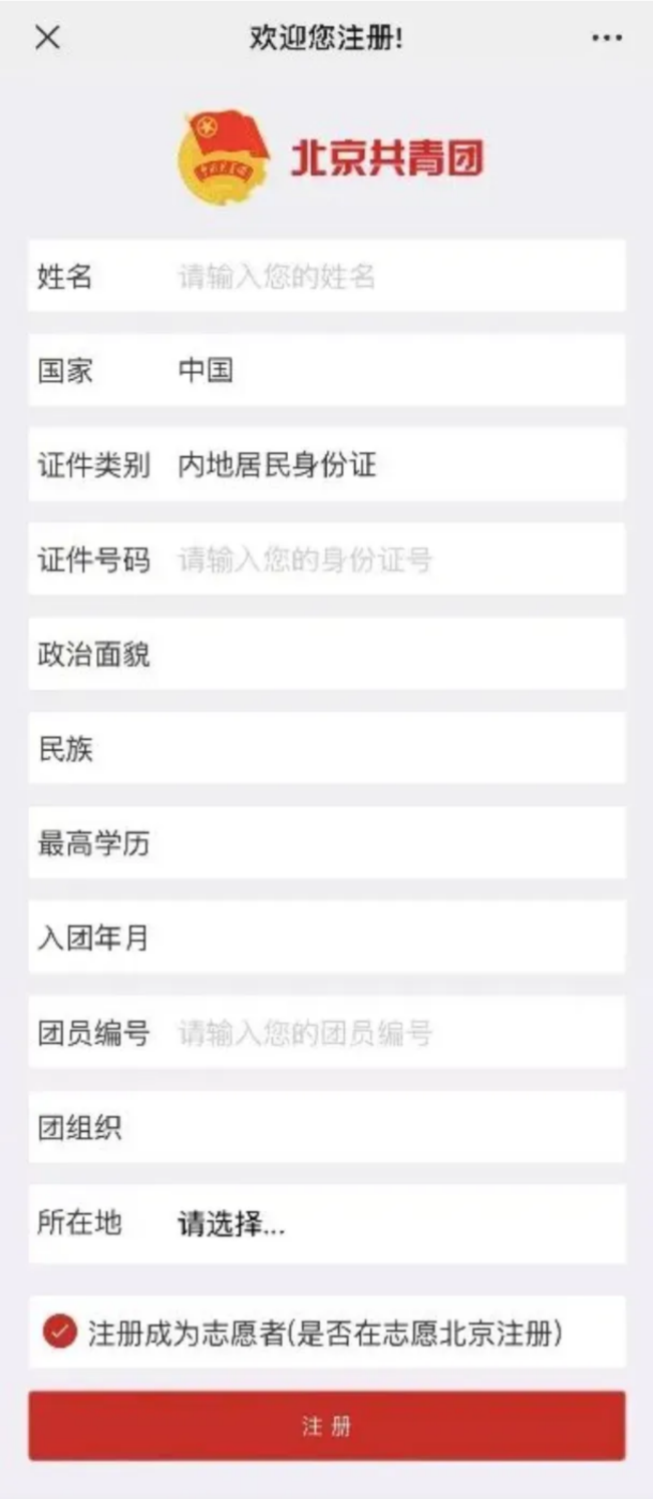 (4)注册时,请团员输入真实准确的姓名和身份证号,否则会影响团组织关系的成功转接。所在地选择海淀区-北太平庄街道办事处-师范大学社区居委会,团组织需输入新生团支部全称。