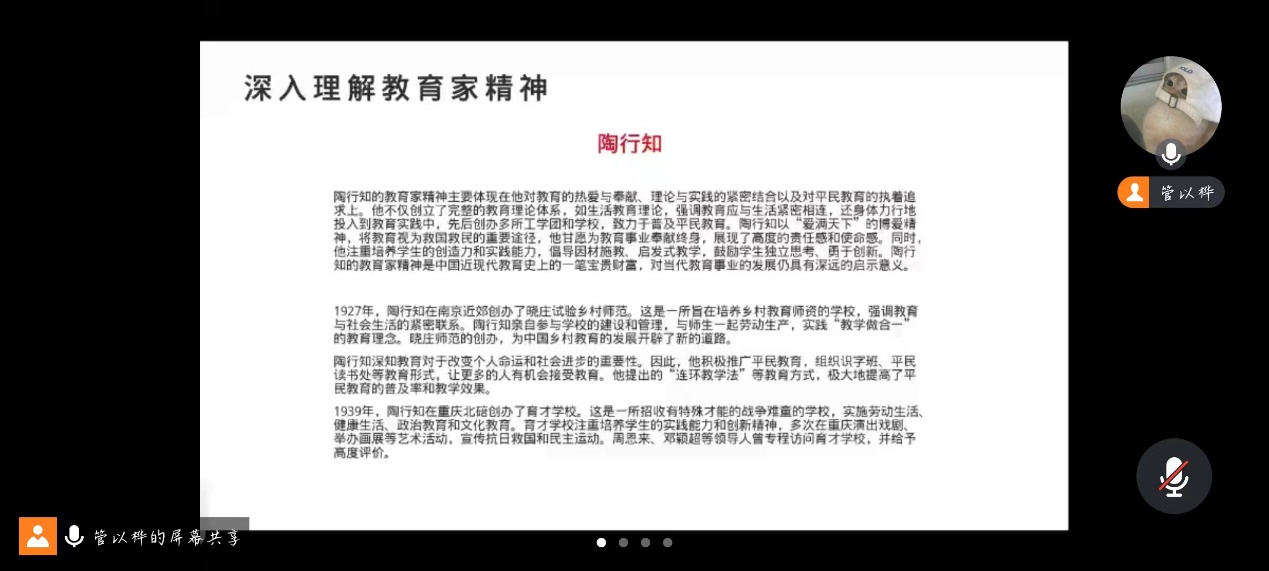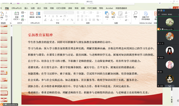 会上,在管以桦团支书的介绍下,同学们不仅深入地领悟了孔子、陶行知及蔡元培三位伟人深邃的教育思想,更透彻地理解了自古以来伟大教育家们所秉持的“传道受业解惑”之崇高使命,以及他们身上所闪耀的智慧光芒与不懈追求教育真谛的伟大教育家精神。这份跨越时空的教育家精神,如同一股清泉,滋润了每一位同学的心田。相信通过此次活动,每一位同学都深刻认识到自己肩上的责任与使命,更加坚定了为实现教育强国梦想而不懈奋斗的信念。
