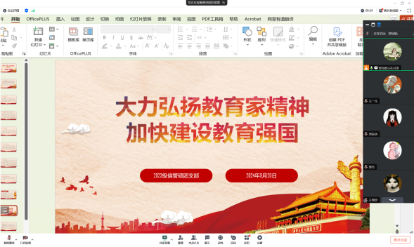 2024年9月20日晚,23级信管硕士班在线上举行“大力弘扬教育家精神,加快建设教育强国”的主题团日活动,活动旨在弘扬教育家精神,希望同学们能够以教育家为榜样,认真学习教育家精神内涵,积极参与到弘扬教育家精神的行动中去。本次会议由团支书郭琼皓主持,支部团员参加会议。