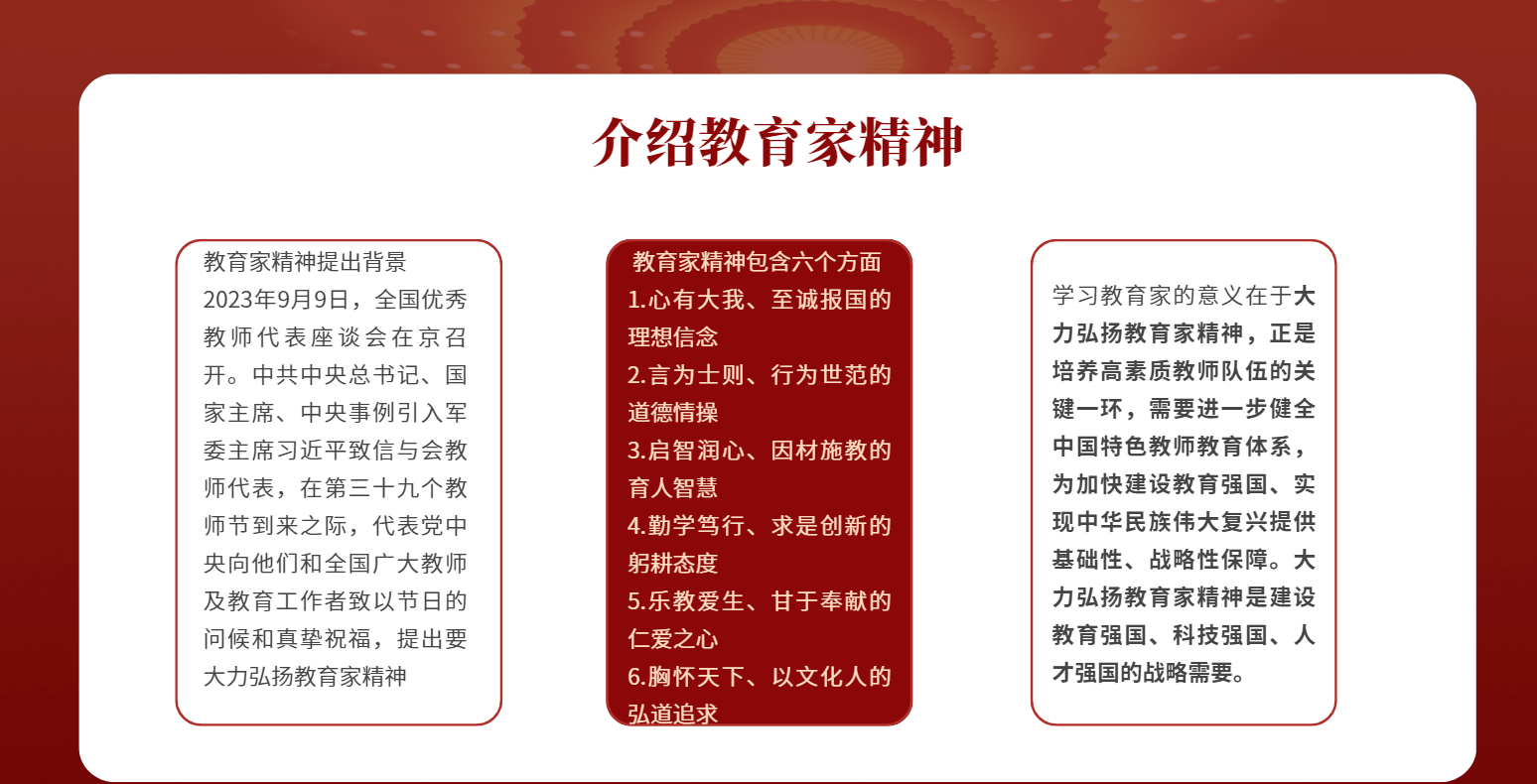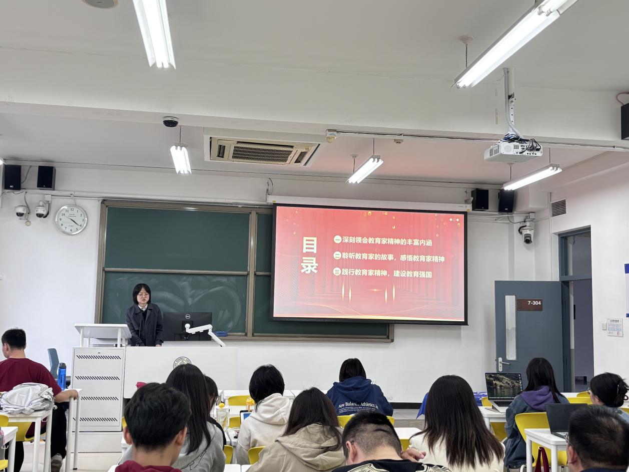 活动中,团支书王欣悦同学设计了三大环节:“深刻领会教育家精神的丰富内涵”“聆听教育家的故事,感悟教育家精神”“践行教育家精神,建设教育强国”,多方位展现教育家精神内涵。