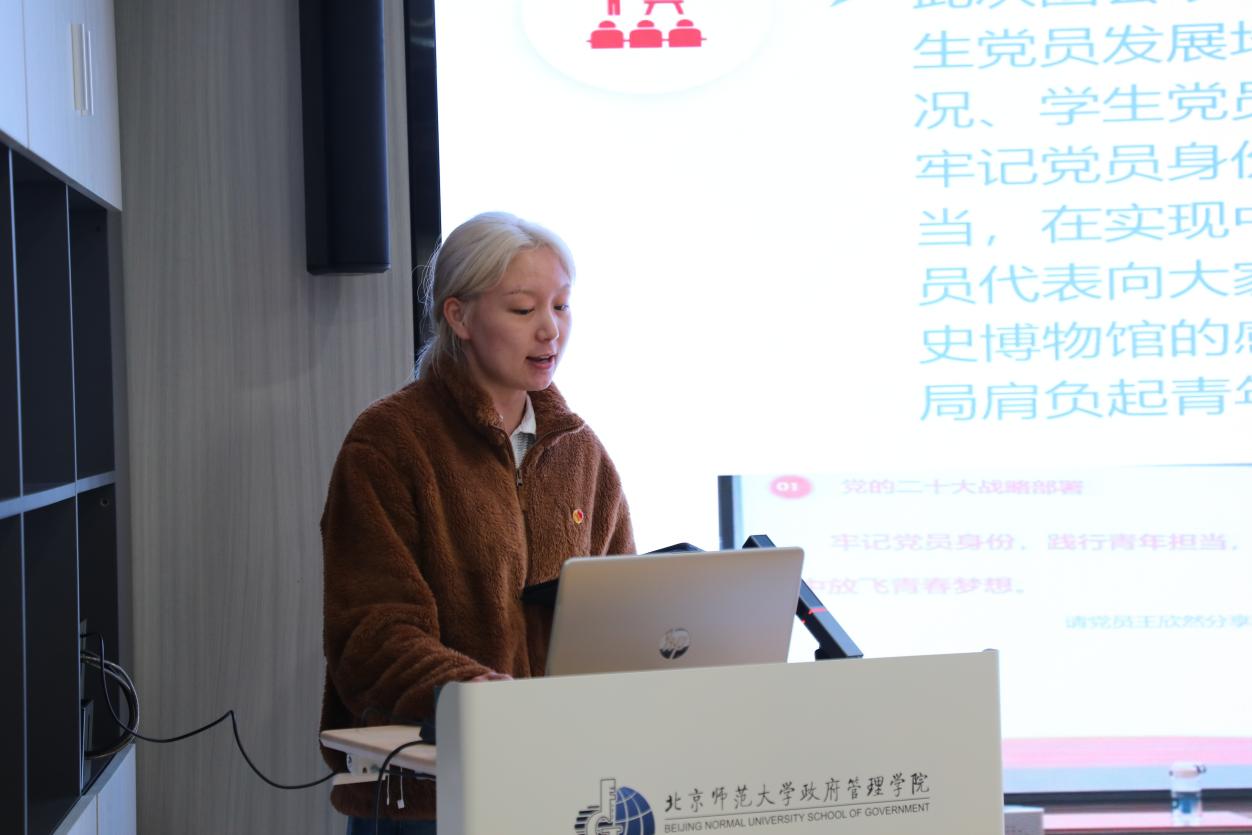 23公管硕3班团支部的团支书齐超慧分别从专题学习、志愿服务和暑期实践三个方面进行了展示。齐超慧同学对支部各项专题学习教育进行深入讲解,例如,在思想旗帜专题学习教育中强化五个“认同”,在挺膺担当专题学习教育中增强不辱时代使命、不负人民期望的意识。此外,通过暑期社会实践,同学们的知识水平和实践技能得到提升,支部也有了显著的发展。