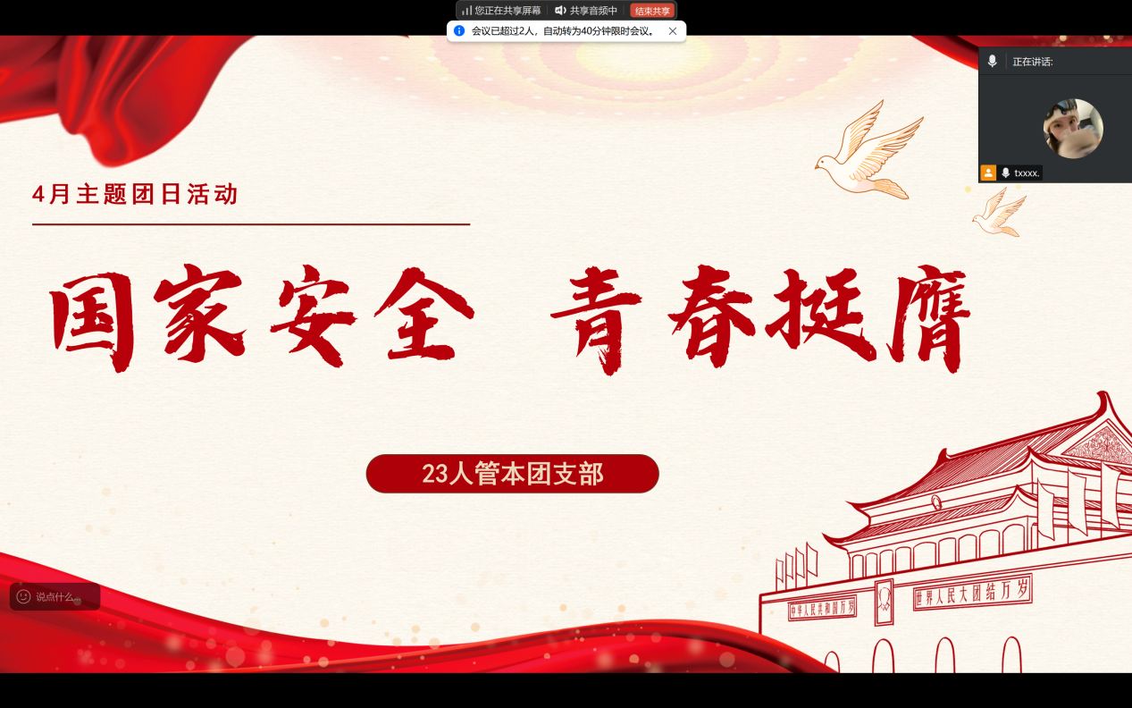 为深入贯彻落实总体国家安全观,强化青年学子国家安全意识与使命担当,23人管本团支部于4月25日召开了“国家安全 青春挺膺”为题的团日活动,旨在提高同学们维护国家安全的意识,激发爱国热情。