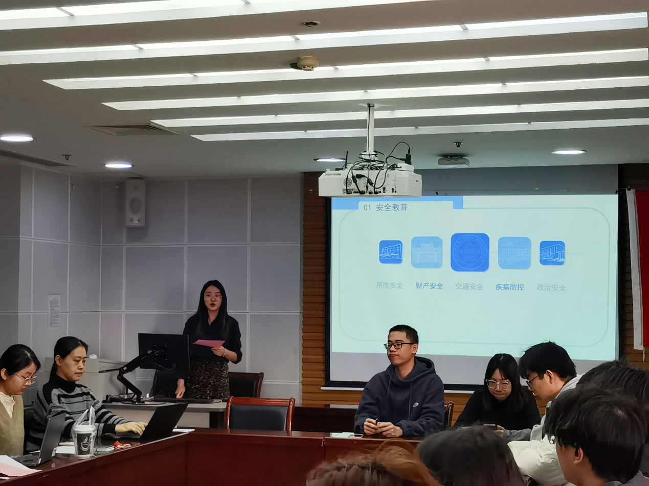会议伊始,班长王雪萌围绕“校园安全与个人防护”展开了简短而深刻的安全教育。王雪萌结合近期高校的典型案例,从用电安全、财产安全、交通安全、疾病防控、政治安全等方面提出了具体建议,用精炼的提醒为同学们敲响了安全警钟,提高了大家的安全防范意识,为新学期的生活筑牢了安全防线。