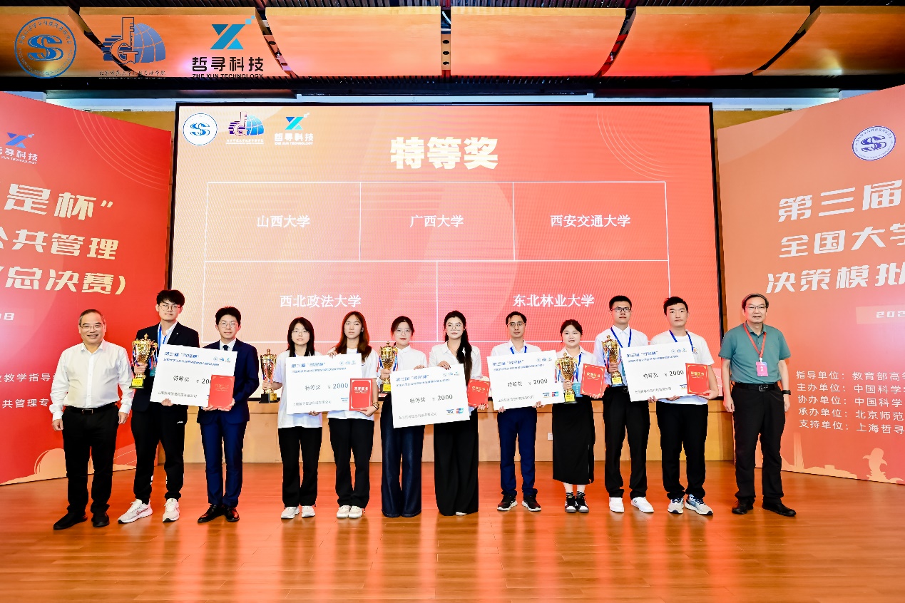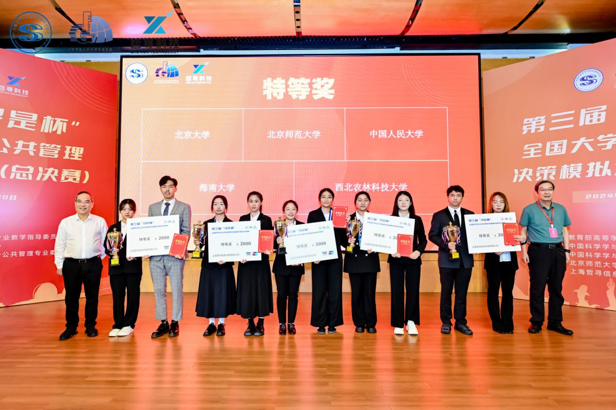 随后,章文光宣读第三届“寻是杯”全国老员工公共管理决策模拟大赛(总决赛)的获奖名单。北京大学等10所高校团队获得特等奖,东北大学等35所高校团队获得一等奖,中央民族大学等45所高校团队获得二等奖。最佳公共管理方案奖、最佳公共管理模拟决策奖、最佳团队奖分别由北京大学、西北农林科技大学、英国威廉希尔公司等9所高校团队摘得。