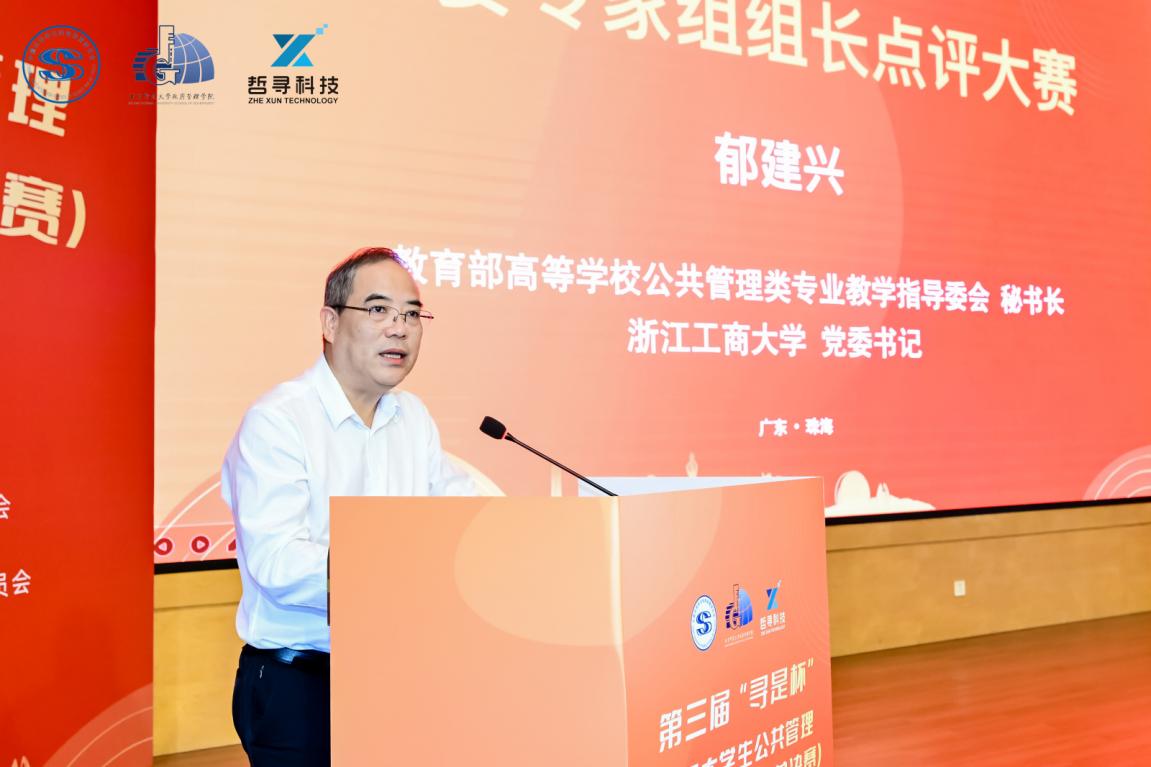 郁建兴代表评委专家组对大赛进行点评。郁建兴对大赛的公信力和影响力给予充分认可,对各参与方的努力与付出表达感谢。他指出大赛的多元形式适应公共管理学科当下育人所需,有利于塑造高素质、专业化人才,盼望着同学们提升逻辑思维能力和综述能力,不断为公共管理团队建设发展增添新动能。