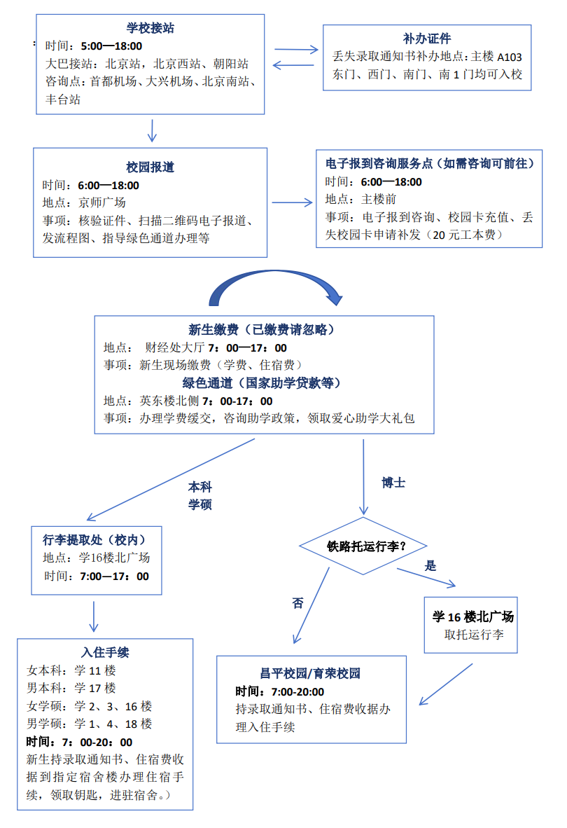 昌平校园G区、育荣校园住宿的新生可在海淀校园提取托运行李后,乘坐班车前往对应校园。