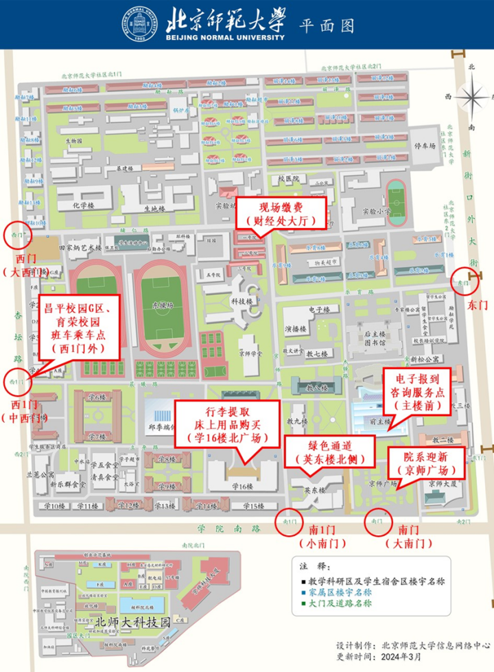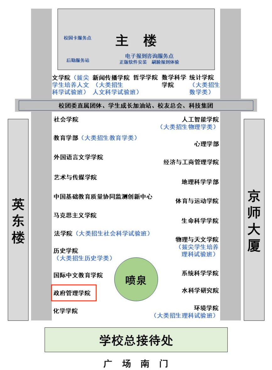 “迎新接待站”地点:海淀校园京师广场(主楼南广场)