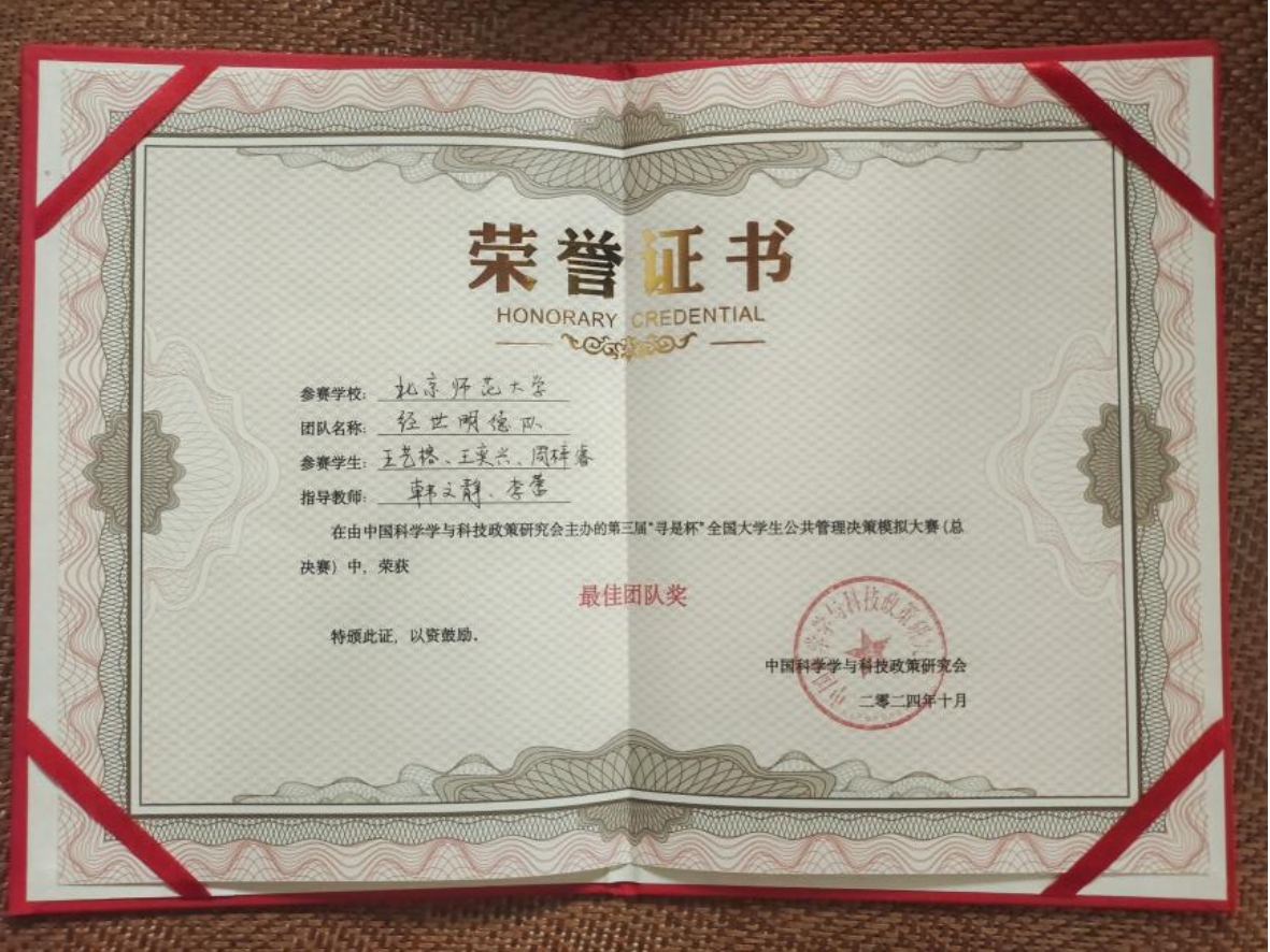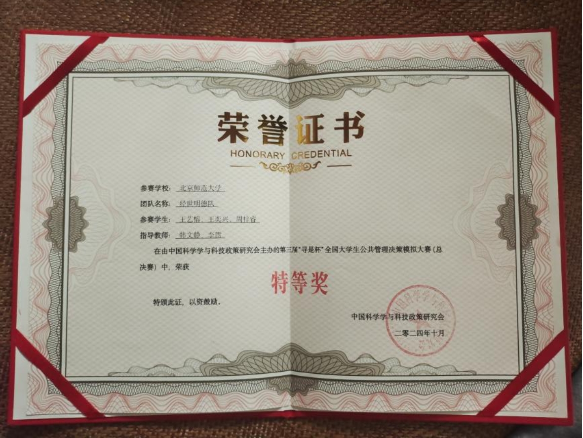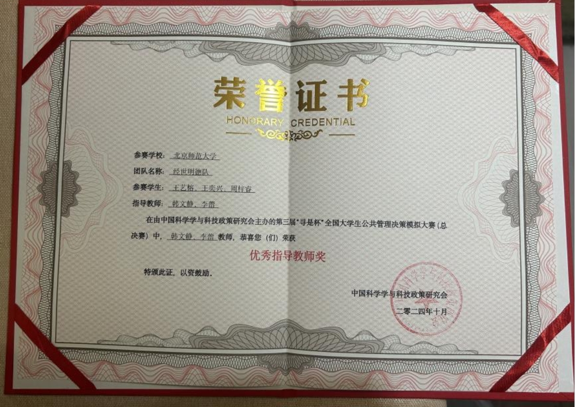 由公司韩文静老师、李蕾老师指导,2022级公共事业管理班本科生王艺榕、王奕兴和2023级公共事业管理班本科生周梓睿组成的“经世明德队”斩获大赛特等奖,并获得“最佳团队奖”。韩文静老师和李蕾老师获得“优秀指导教师奖”。