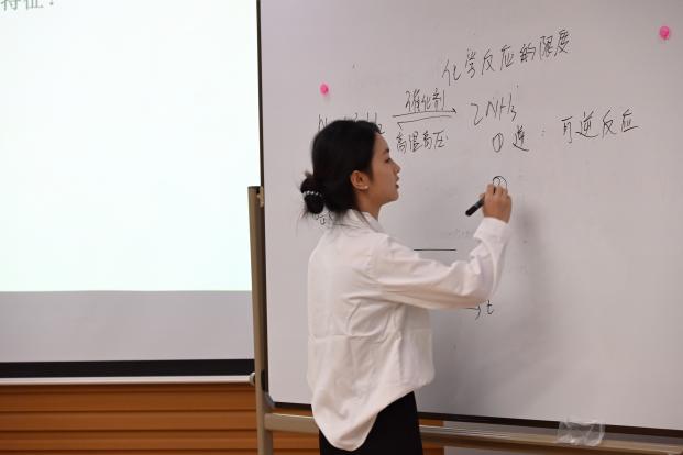 第四位上场的选手是2022级信息管理与信息系统专业的张艺玮同学,她讲解的内容是化学反应的限度。张艺玮同学从新制氯水的颜色引入课程主题,并以工整的板书总结化学平衡状态的五个特征,逻辑严谨,清晰明了。
