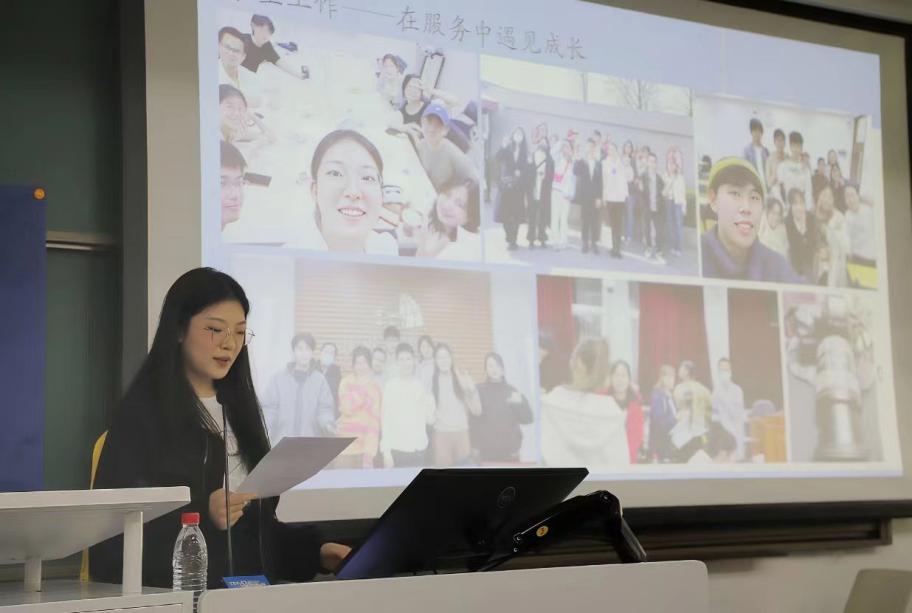 会议第三项,优秀学长代表发言。王艺榕同学就员工工作、社团活动、志愿活动、假期实践、职场实习几个方面给大家分享了安排课余生活的经验,她在分享中提到,学长计划既是一场双向治愈的成长之旅,也是一次传递温暖、获得价值感的精神共振。她真挚的分享不仅给大家的课余生活提供了有益指导,也为大家指明了成长的道路。