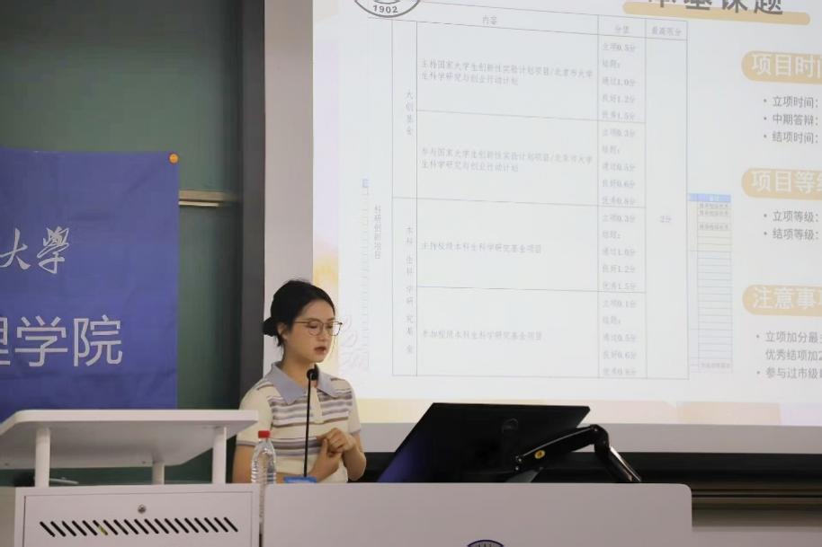 随后,杨洋同学围绕着科研竞赛展开了分享,她讲述了自己的科研竞赛经历,并向同学们详细介绍了京师杯、大英赛等竞赛的流程,让同学们加深了对竞赛的了解。除此之外,她还提到,这一年在回答学弟学妹提问的过程中也让她对老员工活产生了更多新的思考。未来,她期待着学长计划的精神能继续地传承与延续。
