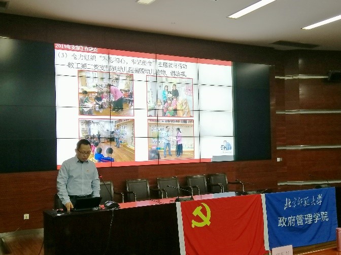 博士生党支部介绍了党支部基本情况和基本工作情况如三会一课等,与校外优秀毕业生共建活动等工作创新,以及不足之处与改进计划。公共管理专业硕士生党支部主要介绍了思想政治工作、组织生活工作、党员教育工作、党员发展转正工作以及“不忘初心,牢记使命”主题教育工作。此外,还播放了公共管理专业硕士生党支部原创《我和我的祖国》小视频。