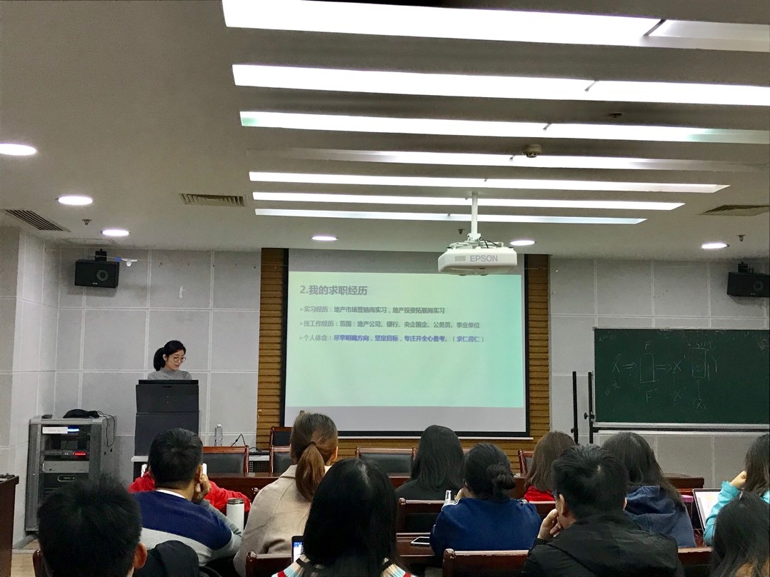 此次交流的主题为公务员考试经验与心得,高姗姗师姐主要从自身求职经历、就业选择的因素、公考复习等方面为同学们进行了全面介绍和阐述,并建议大家尽早坚定自己的目标,并为此专注准备。