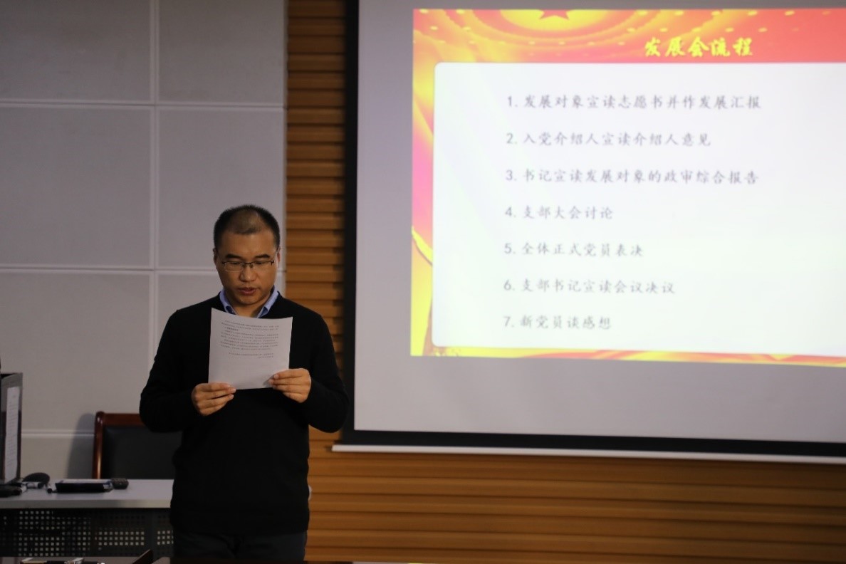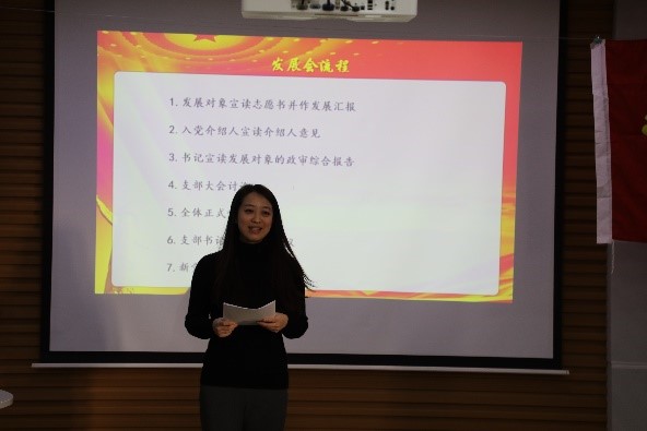 大会第二项,发展对象刘丽莉宣读入党志愿书并作发展汇报。刘丽莉对其学习和工作经历进行了介绍,并汇报了其入党的心路历程。她从自身的海外求学和生活经历出发,意识到海外学子之所以能有底气地在国外安然生活和学习,是源于祖国这个强大后盾的坚定支持。作为一名中国人,在国外感到深深的自豪与骄傲,这一切是离不开中国共产党的领导的,因此在获得博士学位后,迫不及待地学成归来,报效祖国。回国工作后,在逐步深入的理论学习与立足扶贫的实践调研中了解国情、党情、社情和校情,因此她希望能够早日加入中国共产党,努力为中国人民谋幸福、为中华民族谋复兴中贡献出自己的一份微薄之力。