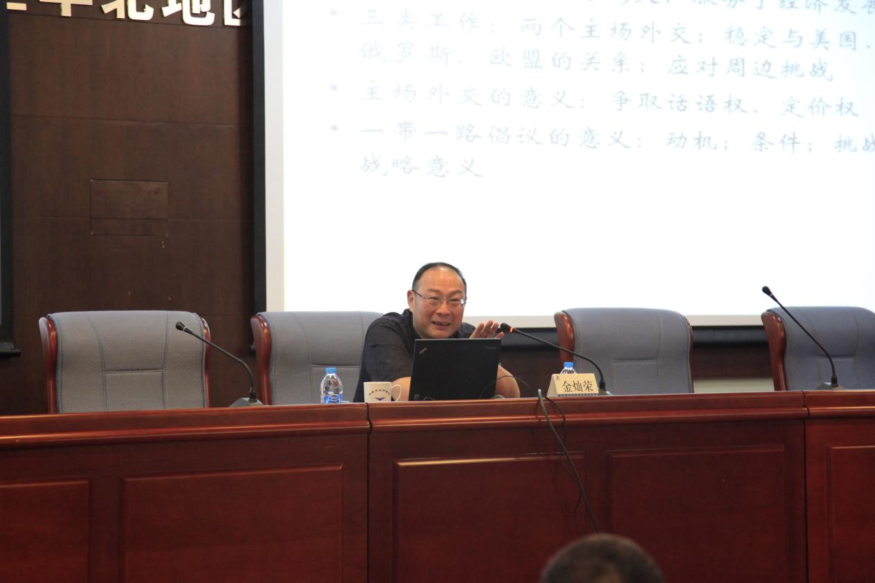 授课伊始,金教授惟妙惟肖的分析了法国、德国、印度、俄罗斯等国家的当前政局,使大家仿佛身临其境。随后,他从国际国内政治经济背景解读了一带一路战略,提出一带一路战略的提出本质是中国经济发展到一定阶段的产物。在谈到中国在和平时期三层次的竞争中,如何实现中华复兴的问题时,列举了众多的实例:中国以出口总额世界第一,63%机电产品、20%密集型产品的出口结构,获得第一层次的产品竞争;中国以世界第一的专利数量、重型机械的产出率及制作水平和帮英国造核电站和高铁等举措,获得第二层次的技术竞争;中国通过大量主场外交获得最高层次的话语权和竞价权。金教授观点独特,学识广博;语言幽默诙谐、深入浅出,激发了青年们作为中国人的骄傲与自豪。