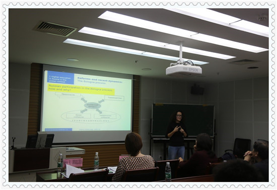 随后Irina SHCHEMELEVA副教授阐述了发展俄罗斯高等教育的关键和教育中经济和社会科学发展趋势。她认为首先要加强商业标准、跨文化交流等课程;其次要增加英语和其他语言授课课程以及双学位项目;增加员工机动性项目和学术、行政教职工;促进多样文化的大学环境,国际化学科体系以及国际化研究实验室和教育中心等。