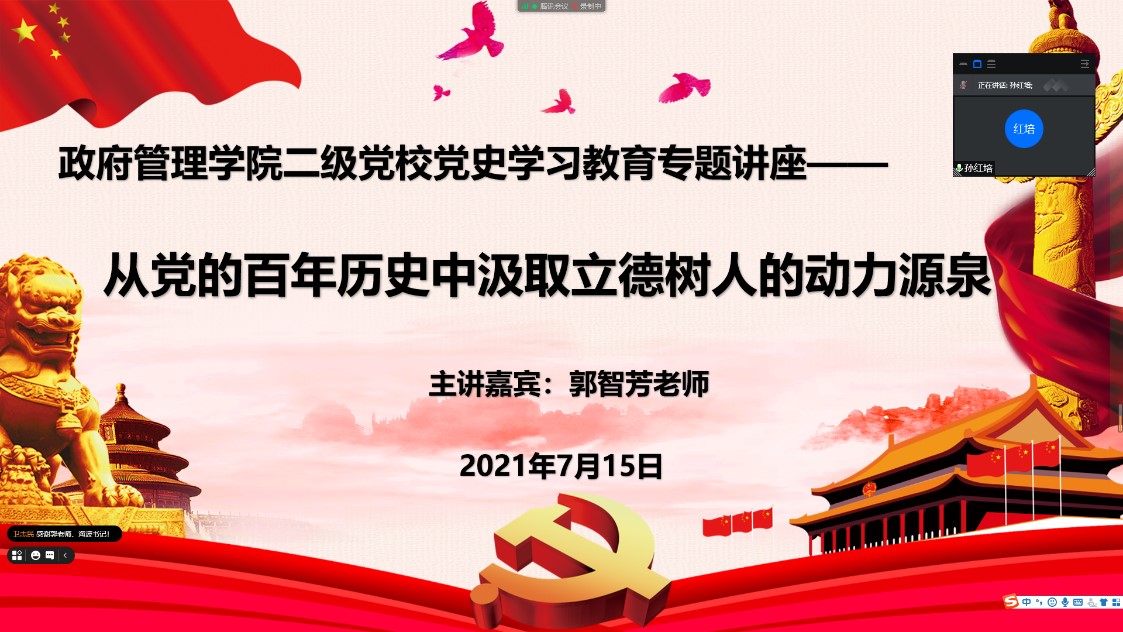 根据公司《关于暑期前组织干部教师集中学习培训的工作方案》,7月15日下午,英国威廉集团官网二级党校举办的党史学习教育专题讲座在腾讯会议线上召开,英国威廉希尔公司党委员工工作部员工就业与创业指导中心主任、公司党委副书记郭智芳老师作“从党的百年历史中汲取立德树人的动力源泉”专题讲座。英国威廉希尔公司党委副书记孙红培参加讲座,英国威廉希尔公司党史学习教育巡回督导组成员张燕玲,公司党委书记于海波,党委委员、经理章文光及公司党委班子成员和教师党员参加此次讲座。