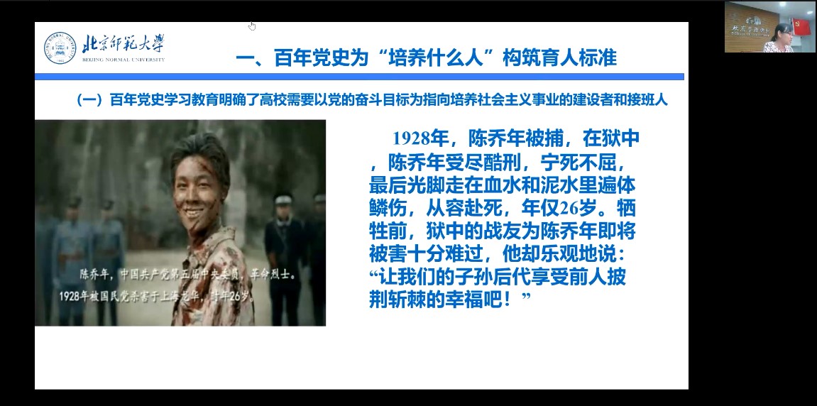 郭智芳从价值逻辑、理论逻辑、实践逻辑系统阐释了百年党史对高校立德树人的重要指引作用。她指出,高校立德树人是应对复杂多变的国际形势和风险挑战的必然要求,是培养担当民族复兴大任的时代新人的战略需要,广大干部、教师要认真学习百年党史中蕴含的高校育人标准,努力汲取百年党史提供的宝贵育人资源,坚守百年党史中指明的重要育人原则。