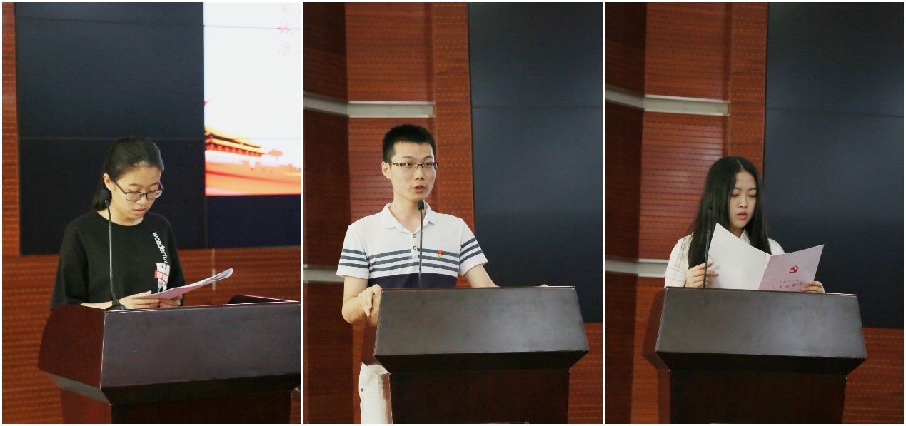 大会第四项,重温入党初心。由党委副书记郭智芳老师带领毕业生党员重温入党誓词,闫倩倩、宋昭、黄宇三位毕业生党员依次朗读志愿书,回顾入党的初心。