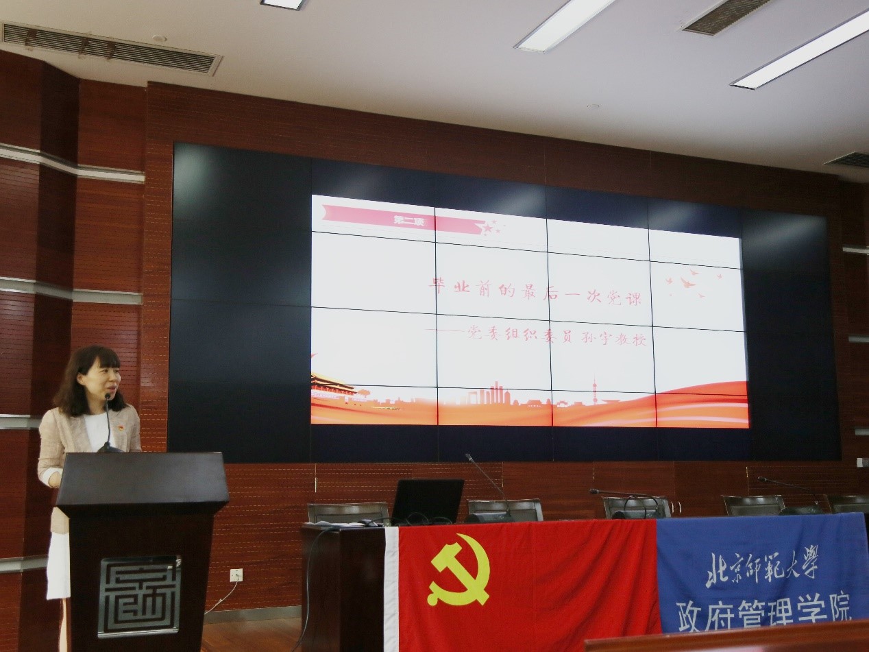 大会第二项,由党委组织委员孙宇教授为毕业生党员讲解了毕业前的最后一次党课。孙宇老师作为党员教师,对即将毕业的党员表达了感激之情,她认为毕业生党员在学期间坚持完成学业,用党员的标准要求自己,秉承校训,使政管的发展越来越好;孙老师教导毕业生党员要牢记使命,坚定信仰,她引用了黄文秀员工的话,指出大家的一举一动都关乎组织,希望每一位毕业生党员未来都是一面旗帜,接着带毕业生党员重温了党章第二条,告诉大家要坚定信仰,对着党旗许下的誓言决不能成为空话;孙老师教导毕业生党员要在竞争路上保持平常心,在烦躁的环境中耐住寂寞,在漫长的人生道路上恪守坚韧,举重若轻。最后,孙老师请全体毕业生党员牢记“为中国人民谋幸福,为中华民族谋复兴”是中国共产党人的初心和使命。
