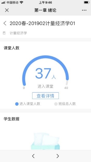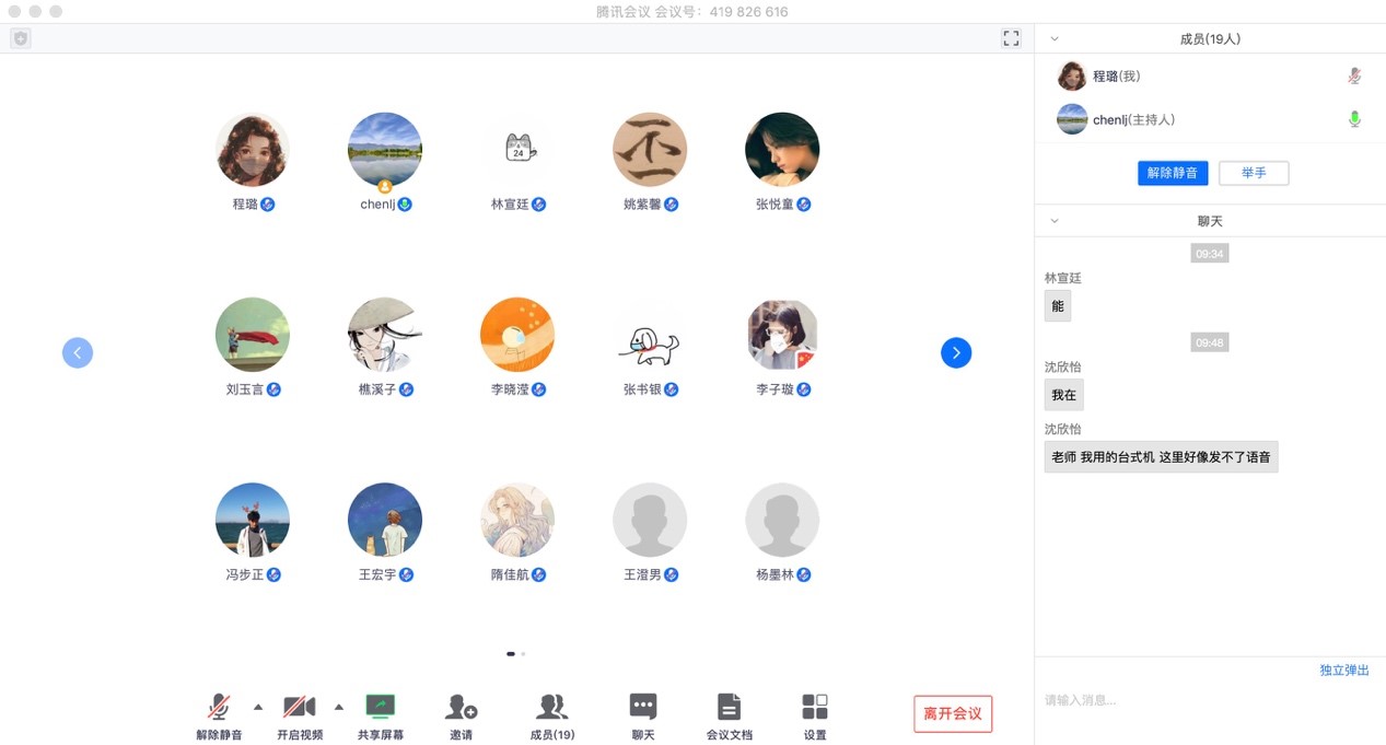 为了保证上午10:00能准时开课,我们提前开好了会议室,在确认了同学们1,2节没有课不会影响到其他课程的情况下,请同学们9:40进入提前测试系统。同学们也非常配合,早早地进入了会议间。在反馈了老师声音及画面正常清晰后,陈老师也抽取了几名同学,请他们回答,除了少部分同学机器问题外,大部分同学的麦克风和扬声器均正常,能支持课上的师生间的正常沟通交流。