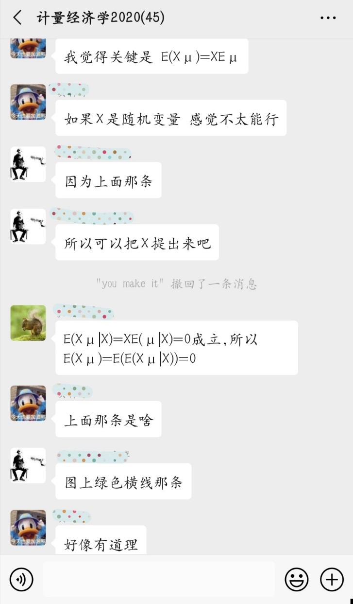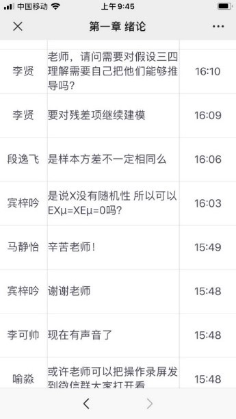 今天是开学第一天,既是同学们计量经济学第一课,也是我的第一节网课,所以无论于他们还是于我,其实都感觉比较新奇。虽然大家隔着屏幕或许有一些不方便,但大家都很热情,课上对于老师提问大家都七嘴八舌地回答,有什么问题也会发弹幕及时和老师沟通,下了课同学们也纷纷在群里对问题提出自己的见解,学习氛围非常浓厚,而这也离不开陈老师在课堂上的引导。