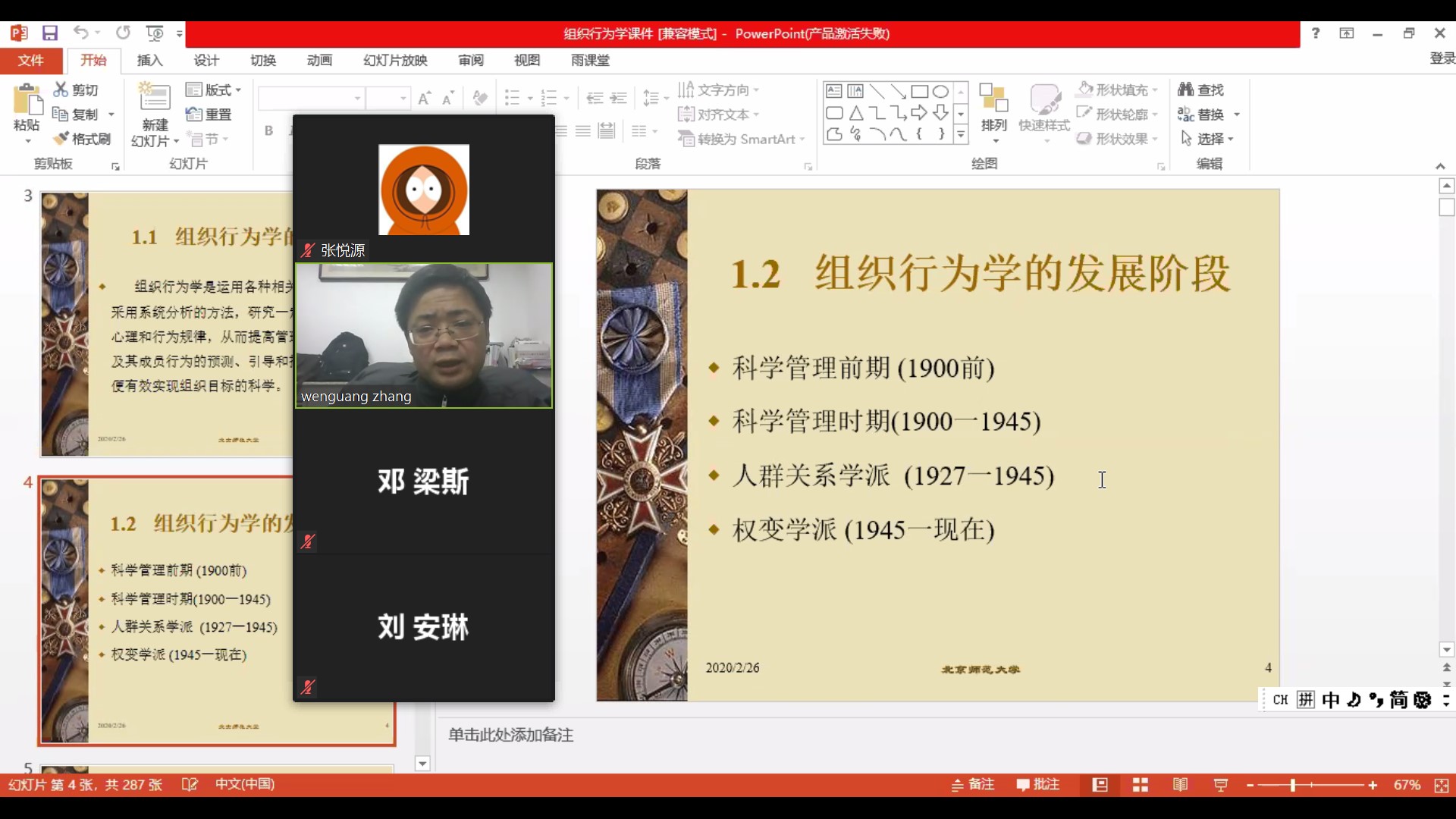 在这个特殊的时期,我也开启了网络授课模式。在前期对网络直播平台的调研、学习,并与员工的沟通中,我们约定使用雨课堂平台进行网络学习,候补方案是使用钉钉平台、微信和BB平台。授课前一天,觉得钉钉可能更稳定些,遂决定让员工将首选定为钉钉。为防意外,在授课前一天的夜里,我抓紧按一讲二节课约90分钟时长制作了授课视频,并上传到BB平台。