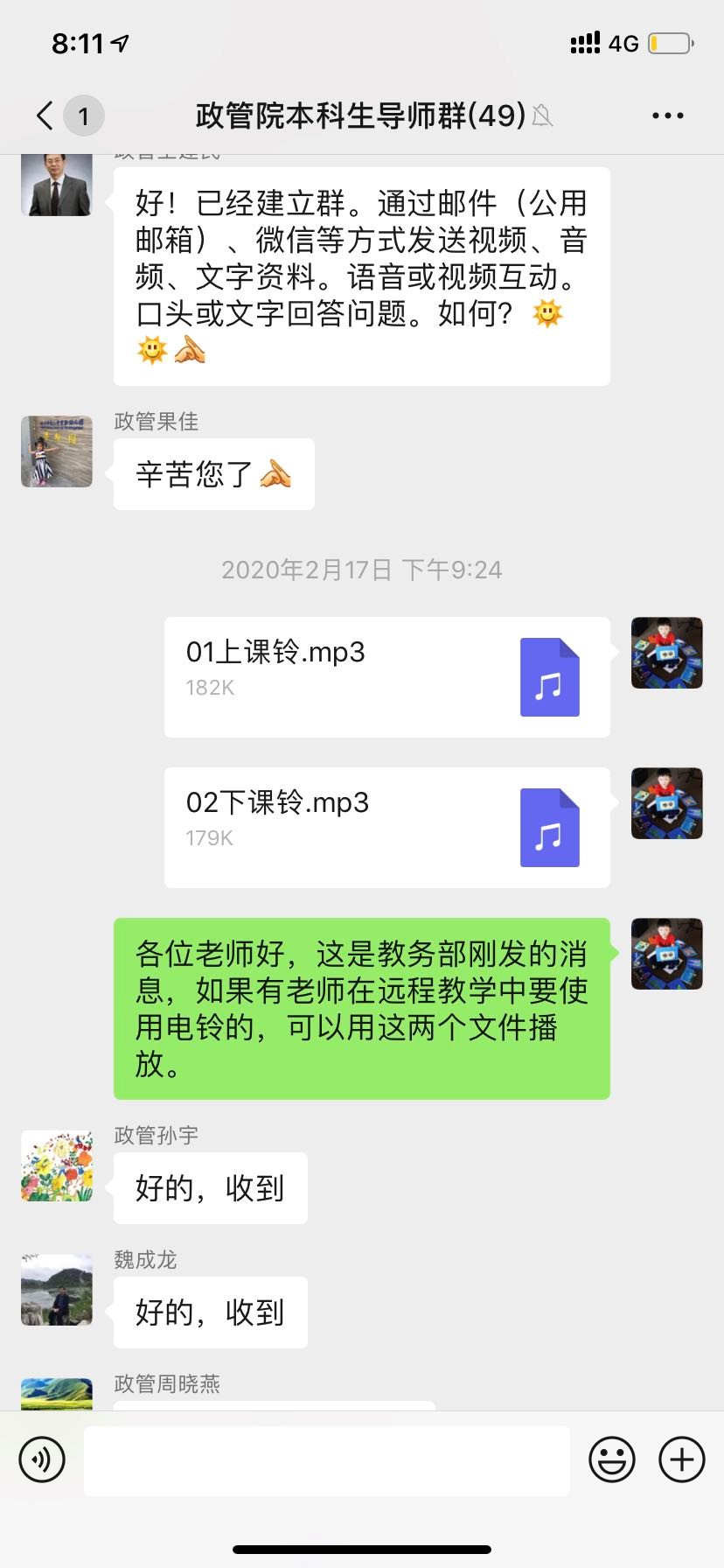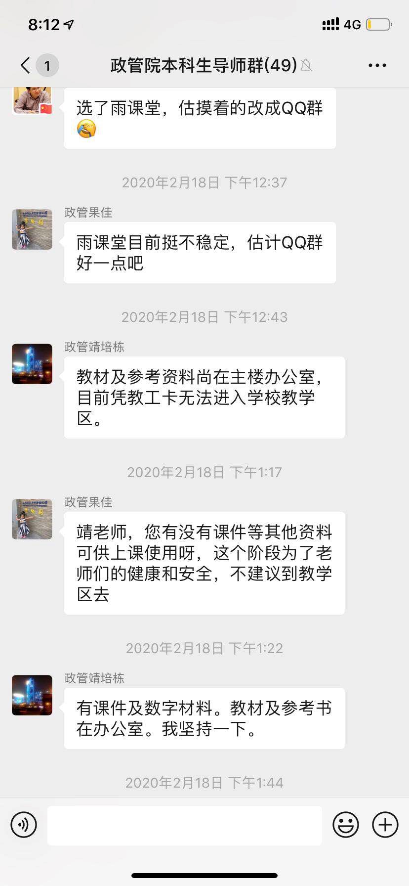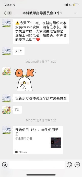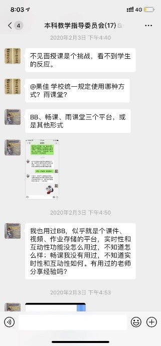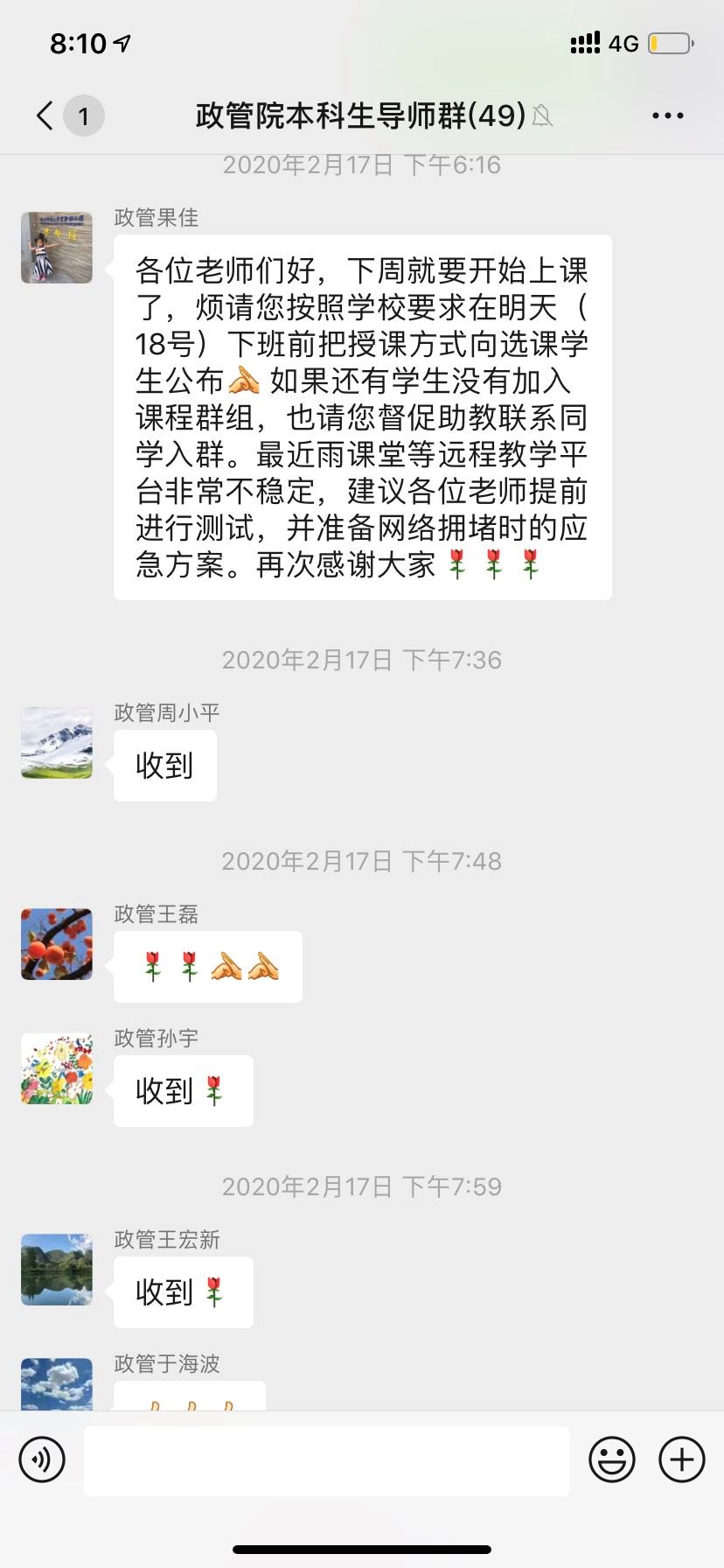 在今天正式开学以后,我们也进一步了解了不同软件实际使用情况并借鉴其他课程的经验,立即确定了数个备选方案,并做好方案排序,以便正式上课后及时做出切换。我带着一些好奇和同学们提前进入了直播课堂,测试了音画效果并及时反馈给老师。课程中老师将课程内容与当前的疫情防控工作相结合,通过弹幕和微信群的方式尽可能地开展课堂互动。课后,对于未能及时进入直播课堂、有效获得较好直播效果的同学我也在第一时间询问了解具体原因,并做好引导或安抚工作。