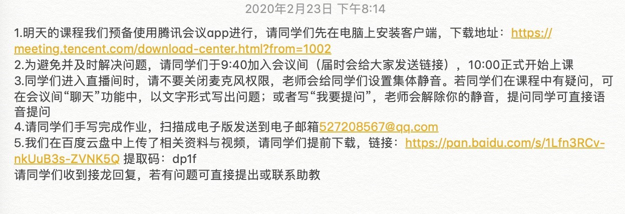 这场疫情对于各行各业都是严峻的挑战,也给了我这样一个教学新兵一个机会来体验不一样的教学模式,并开始初步思考如何利用远程教学模式提高教学质量,这样的思考将贯穿于本学期的课程,期待和同学们共同进步提高。