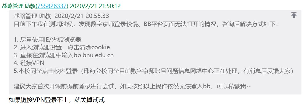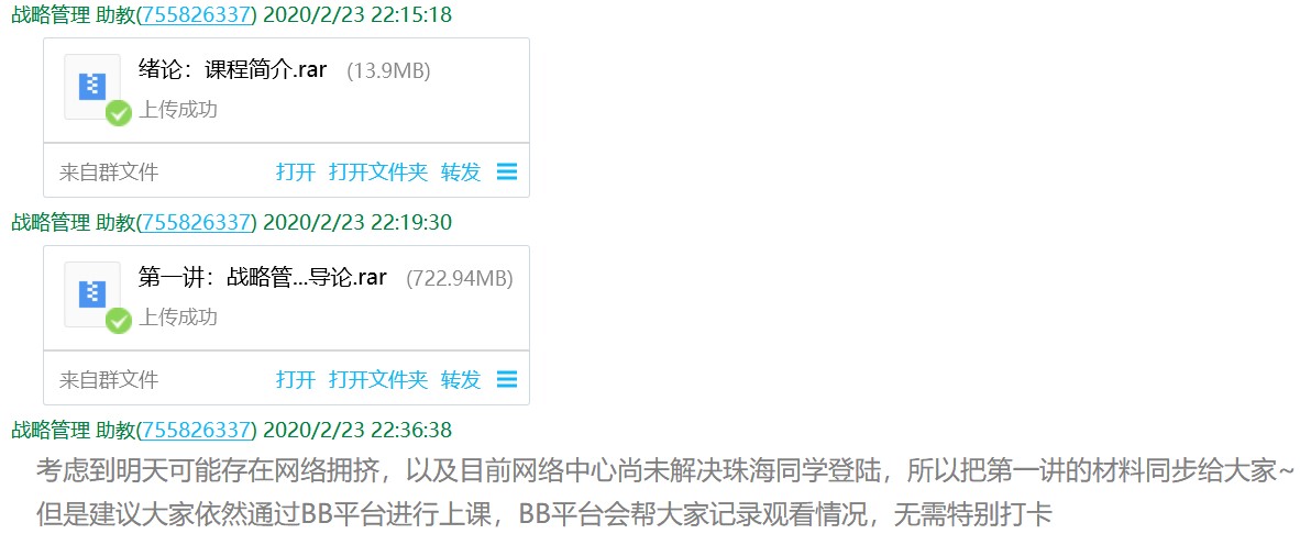 相对于线下教学,线上教学中需预先做好更多的支持与准备工作。我所负责的战略管理课程首次上课时间设定于2月24日开学第一周第一天的上午,属于第一批正式试水线上教学的班级,为降低教学过程中的诸多不确定性,我提前向同学们详细介绍平台使用方法,并进行了BB平台摸牌并向信息网络中心反馈问题,做好网络拥堵、珠海分校员工目前系统暂未打通、临时选课等应急预案。