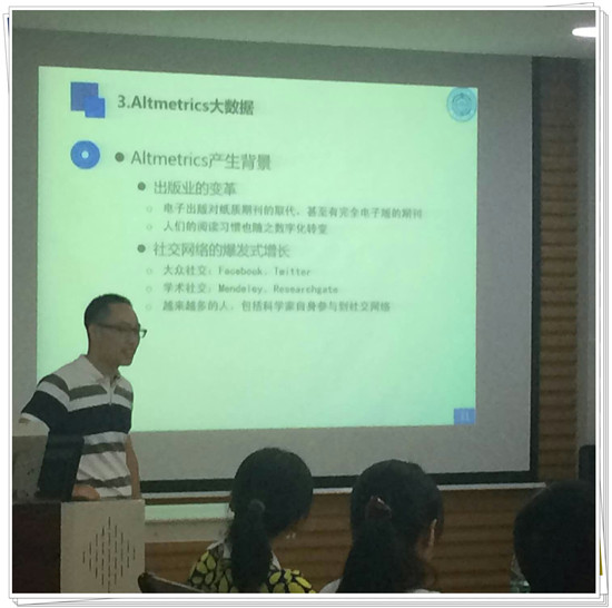 接下来,王贤文副教授围绕altmetrics作了专题讲解。什么是科学计量学?科学计量学是否就是情报学呢?在讲授了科学计量学的概念之后,王老师为大家详细介绍了科学计量学的四大数据对象——发文数据、使用数据、Altmetrics数据、引用数据及其基本内涵,又对科学计量学的研究方法进行了简洁清晰的梳理。为了使我们进一步加深对科学计量学的理解,王贤文副教授又讲了几个具体的研究案例,如借助SSCI论文的合著分析研究中国研究机构的合作网络、论文中参考文献的位置分布研究、基于数千万条专利的共被引分析,研究企业之间的竞争与联系等等。接着,王贤文副教授就科学计量学四大数据对象中的Altmetrics数据做了进一步的解释,包括Altmetrics数据的产生背景、基本概念、测度类别、应用、工具与方法等。