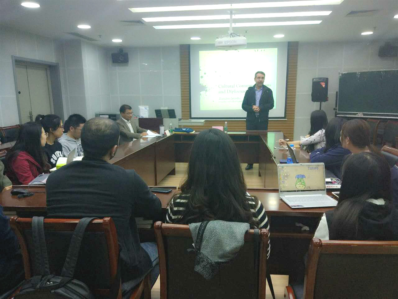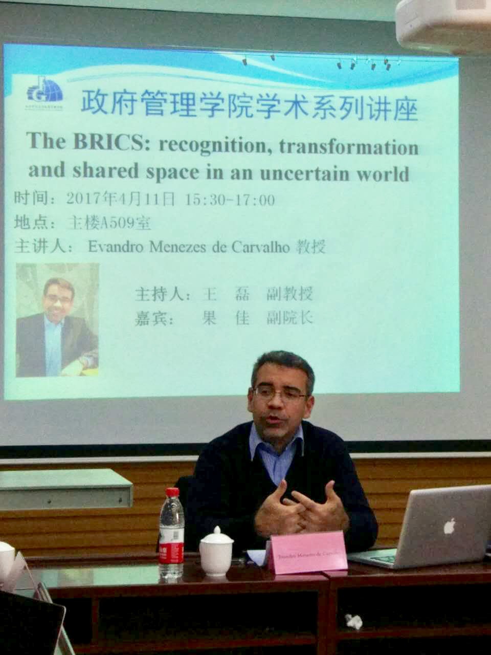 4月11日,Evandro教授在公司509会议室为公司师生作主题为“The BRICS: Recognition, Transformation and Shared Space in an Uncertain World”的专题讲座。他结合当前国际形势,分析了当今世界格局演变中的不确定性。他认为面临逆全球化的挑战,金砖国家必须精诚团结,携手应对发展中的挑战。金砖国家不仅要“向外看”,同时也要“向内看”。“向外”加强协作,促进金砖发展,在推动世界格局演变中发挥更大的作用;“向内”推动金砖五国之间的合作共赢,增强彼此间的信任和好感,同时扩大金砖国家间对话合作范畴。
