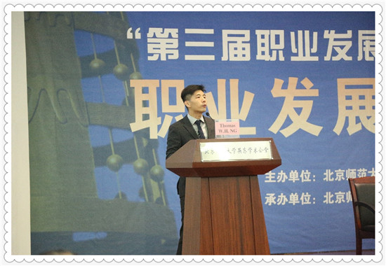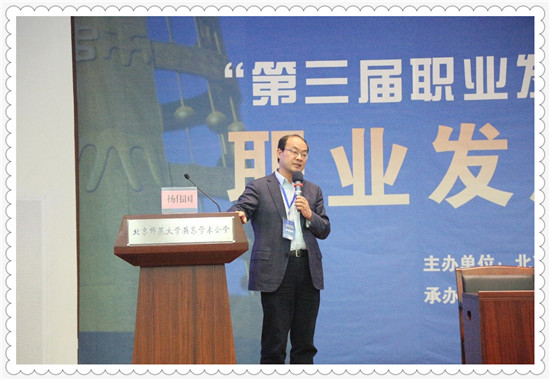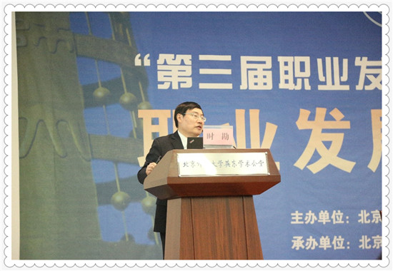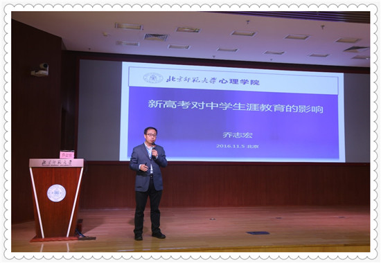 乔志宏教授的演讲主题是“新高考对中员工涯教育的影响”。乔教授根据高考改革激发的生涯教育需求,认为新高考方案的生涯发展意义是自主性的激发,是对个性的尊重,是对创造性的培养,是建设人力资源大国的必要条件,是教育目标的回归,生涯发展的两个核心是自主与自控,生涯发展的重点是自主性的激发。并结合社会认知生涯理论(SCCT),分析了生涯教育的目标与任务、高中生涯教育的内容等。