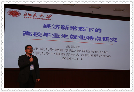 岳昌君教授的演讲主题是“经济新常态下的高校毕业生就业特点研究”。岳教授首先分析了当前的宏观经济背景,总结了十大就业特点,并在此基础上探讨了高等教育质量,分析了经济新常态环境下的整体就业趋势,最后阐述了全球工作特点的变化趋势。