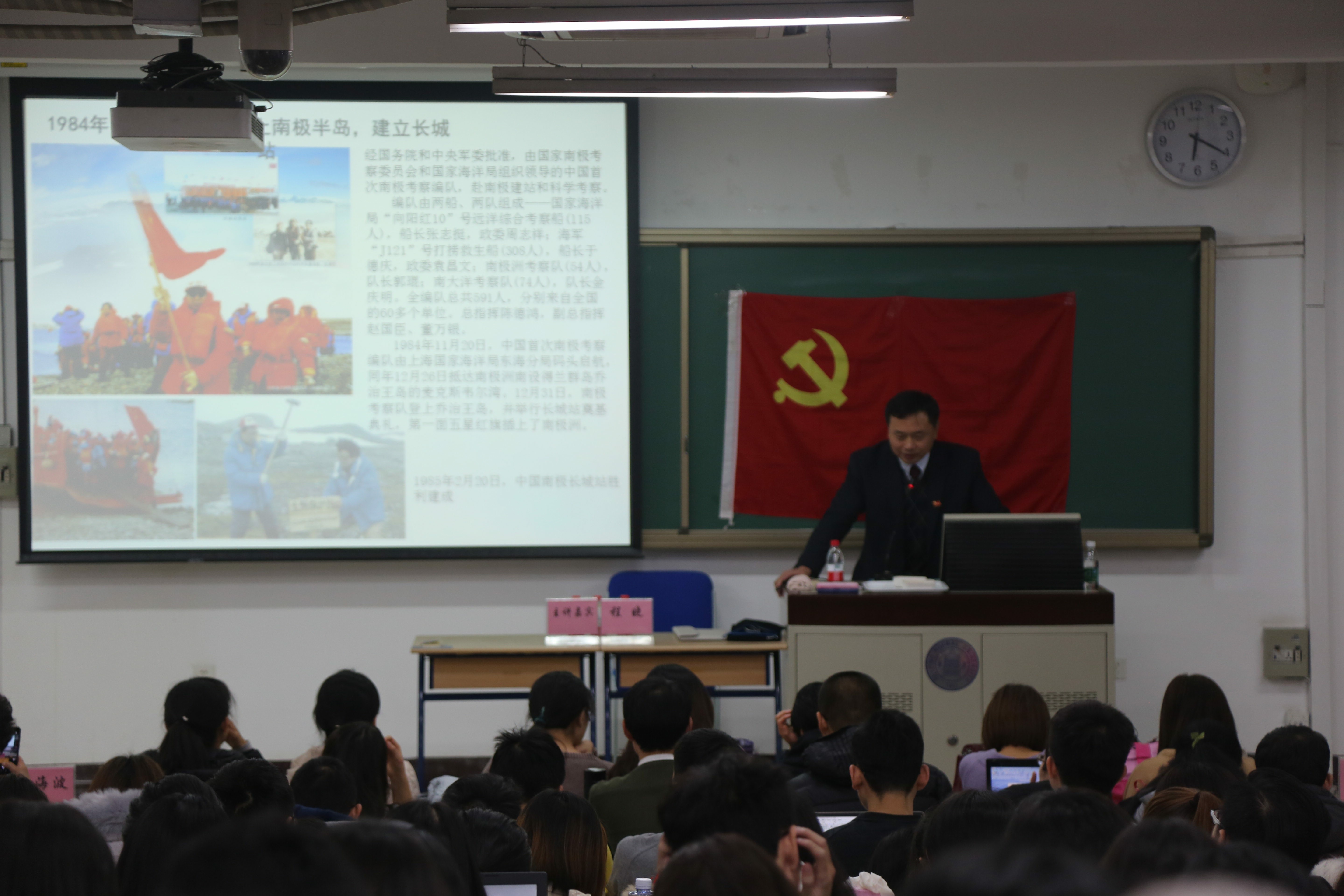 活动伊始,郭智芳老师对主讲人程晓教授进行了介绍。随后,程晓教授开始题为“从中国南极考察看共产党员的责任与担当”的讲座。此次讲座分走进南极、科考经历两个方面展开。