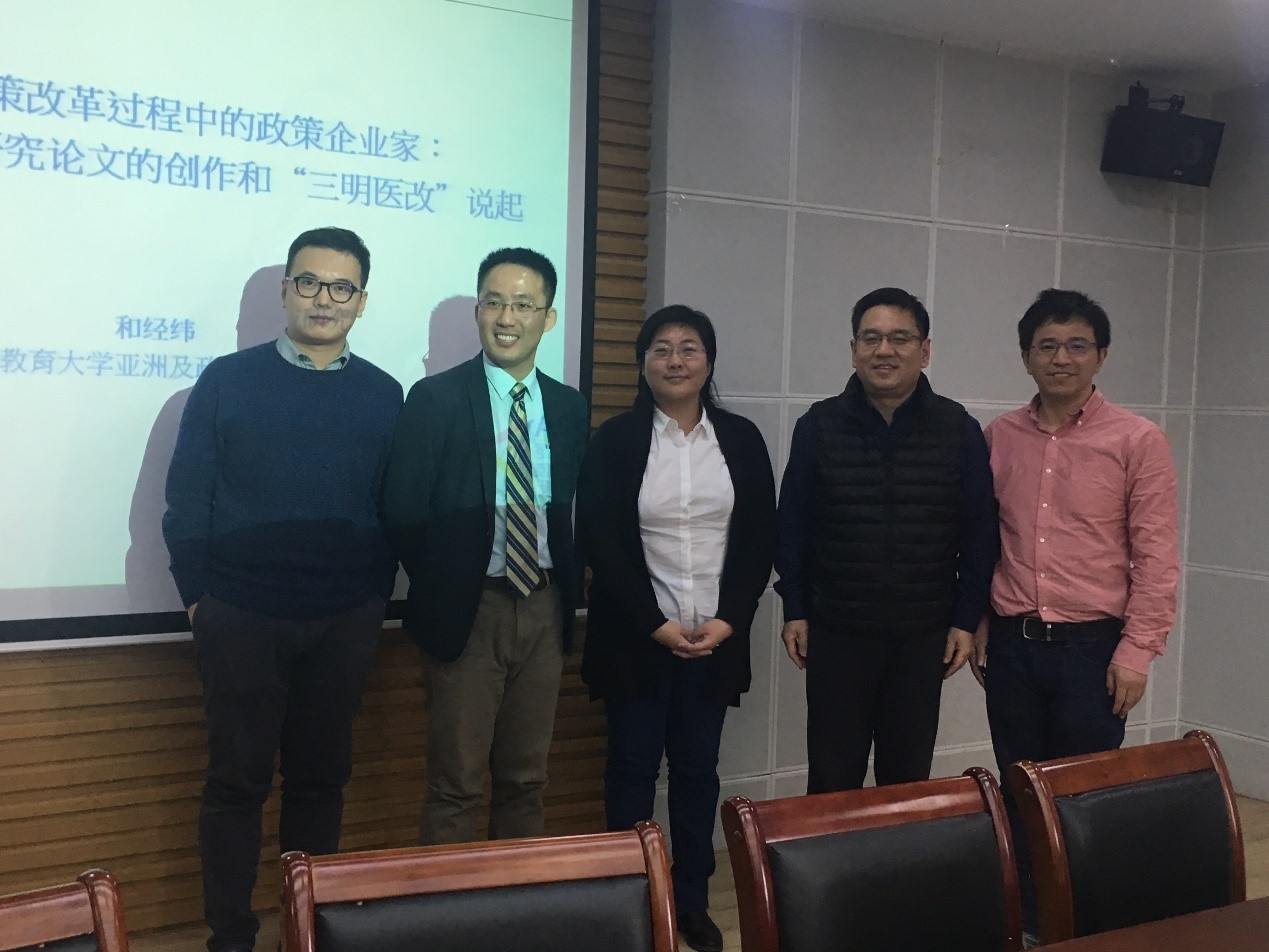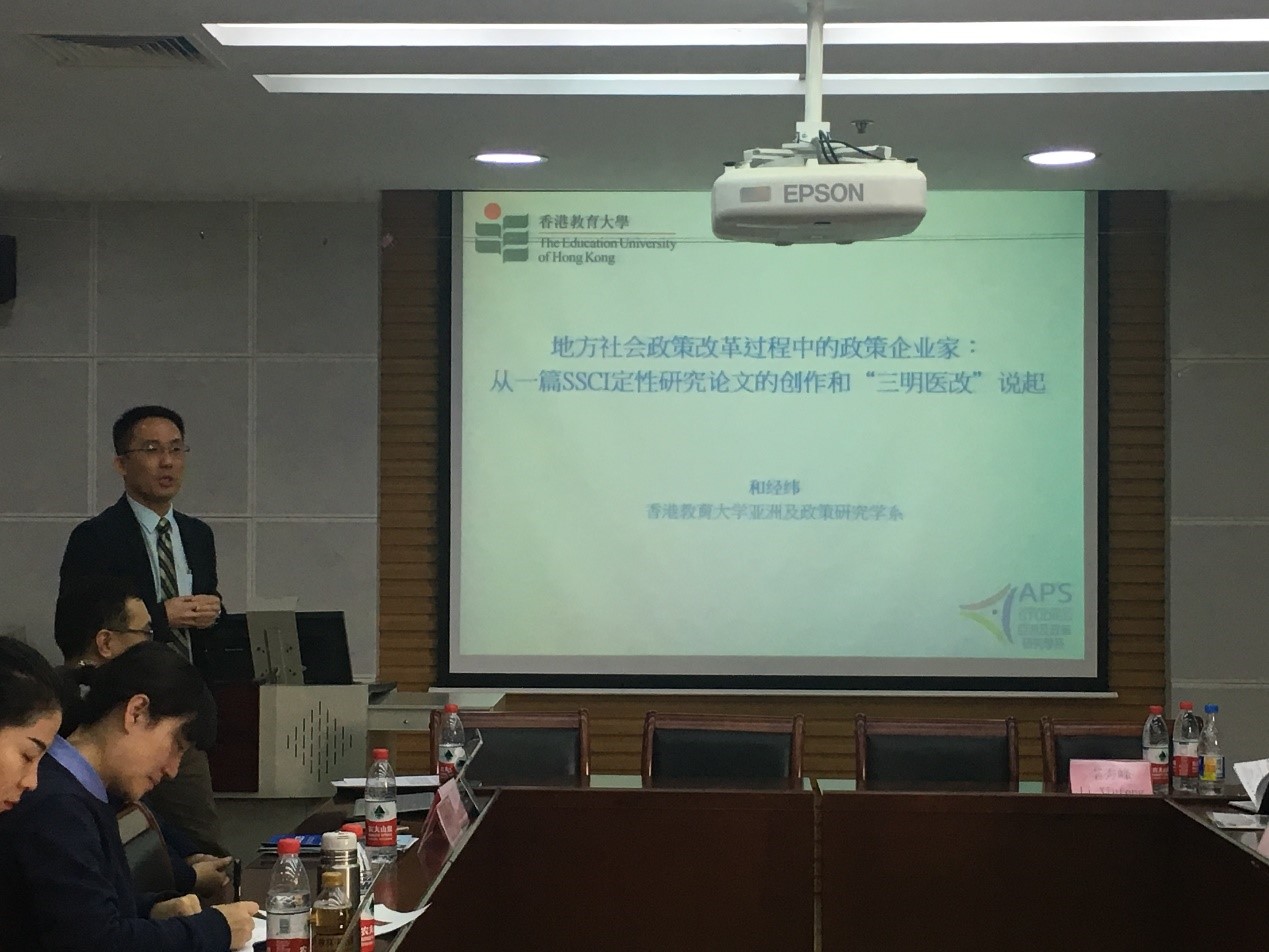 2017年12月21日上午10点,公司公共管理前沿系列讲座第11期在主楼A区509室举行。本次讲座邀请到香港教育大学亚洲及政策研究学系副教授、副系主任和经纬博士,为公司师生作“地方社会政策改革中的政策企业家:从一篇SSCI定性研究论文的创作和‘三明医改’说起”主题讲座。讲座由公司郭跃老师主持,李秀峰教授、果佳副教授进行点评。此外,公司郑雄飞教授、中国人民公安大学丁姿老师以及来自清华大学、中国人民大学以及公司的同学们参加了此次讲座。