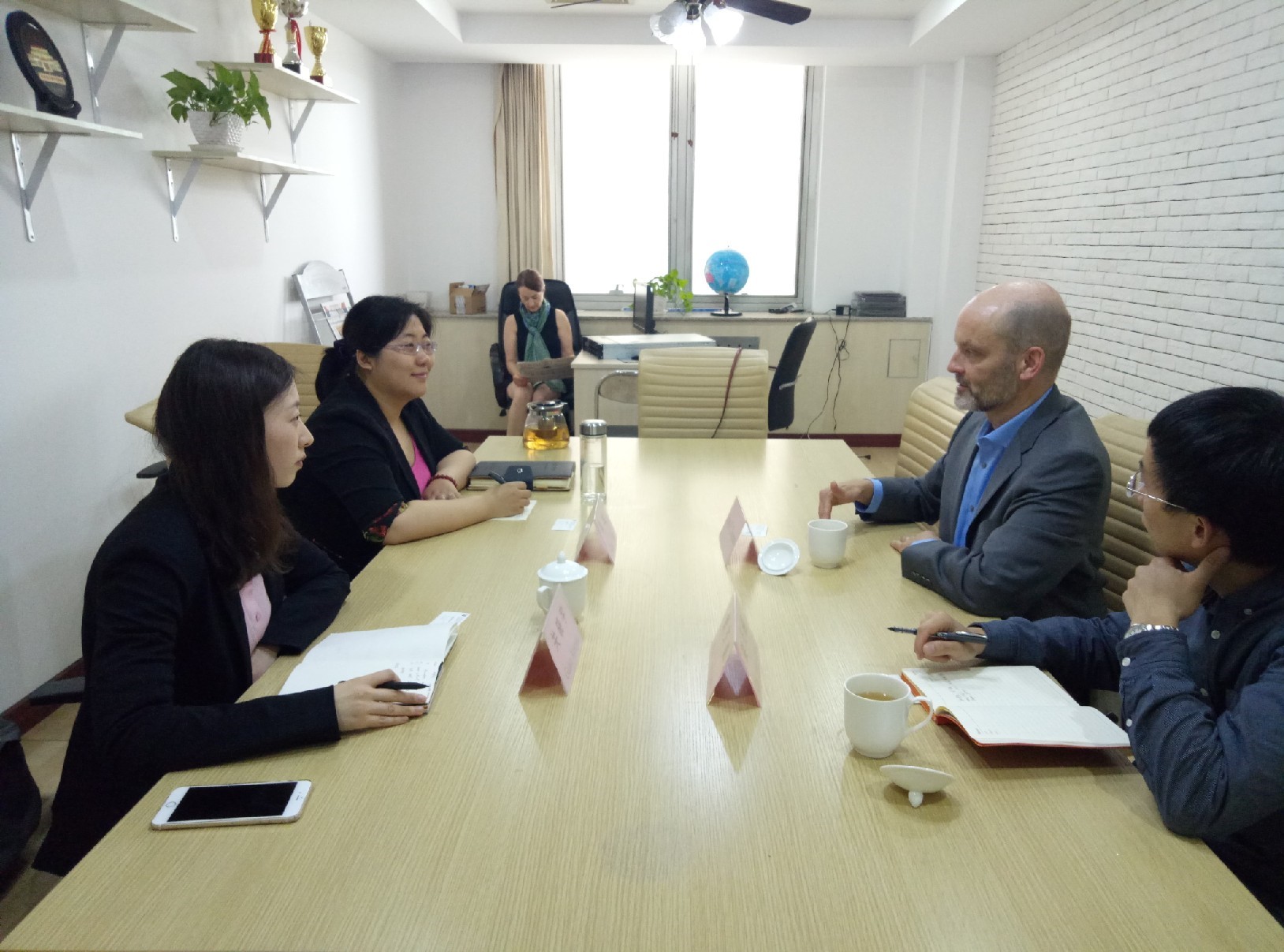 首先,双方交换了名片,由果佳老师代章文光经理对Craig W. Thomas教授的来访表示欢迎。会上,果佳老师和关晓宇老师向Craig W. Thomas教授介绍了公司的基本情况,双方就公司申请NASPAA认证的动机、条件进行了交流,并对公司MPA培养、暑期国际交流等方面的情况进行了深入探讨,交流了双方在MPA、PHD项目、短期访问等方面合作的可能性。