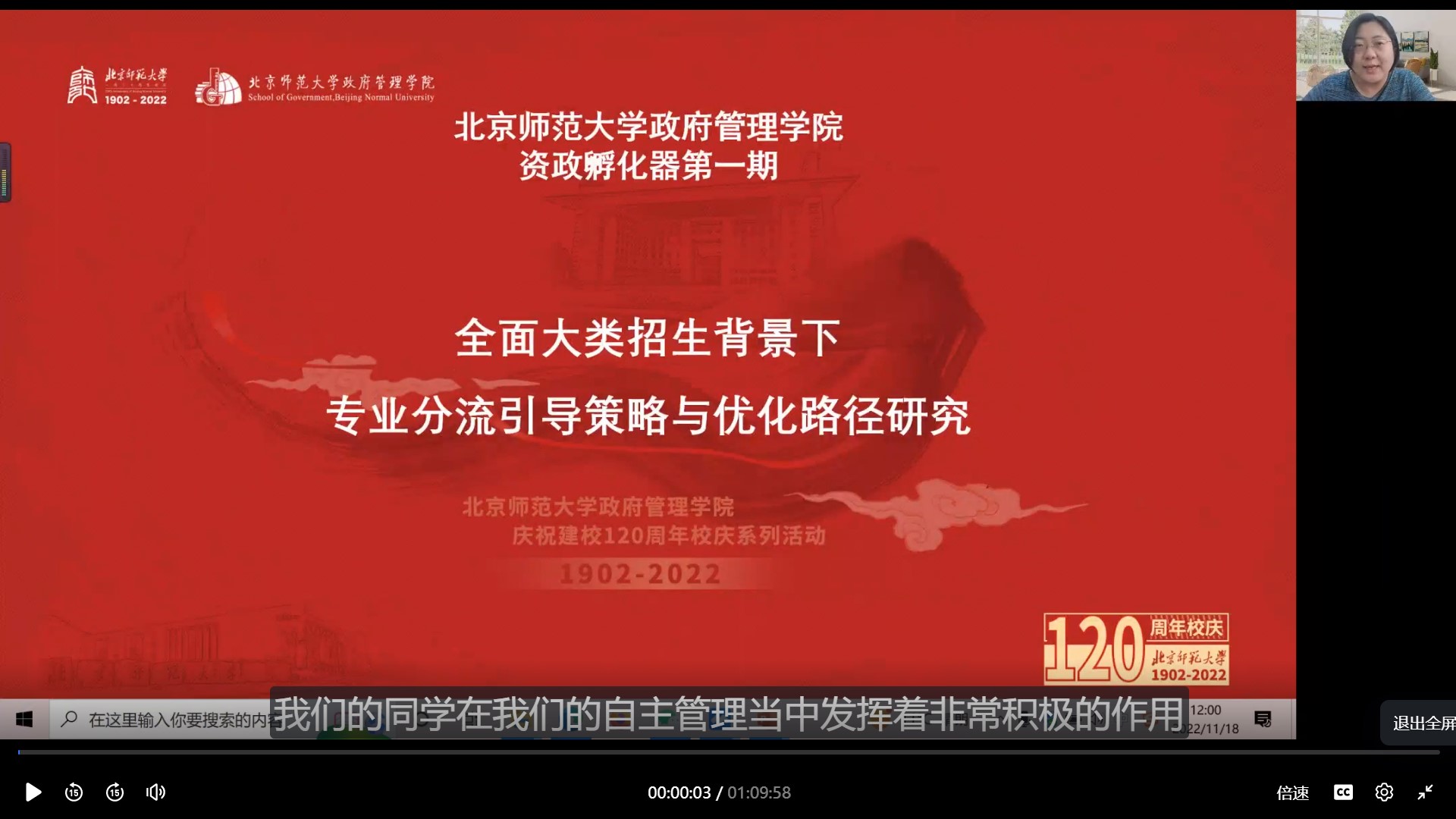 本期孵化的题目为“全面大类招生背景下专业分流引导策略与优化路径研究”。学工课题结项优秀小组ZG-01的四位成员2020级公共事业管理专业刘博研,2020级人力资源管理专业向晖蓉,2020级信息管理与信息系统专业张艺婧,2021级公共事业管理专业张伯千向老师们进行了汇报。