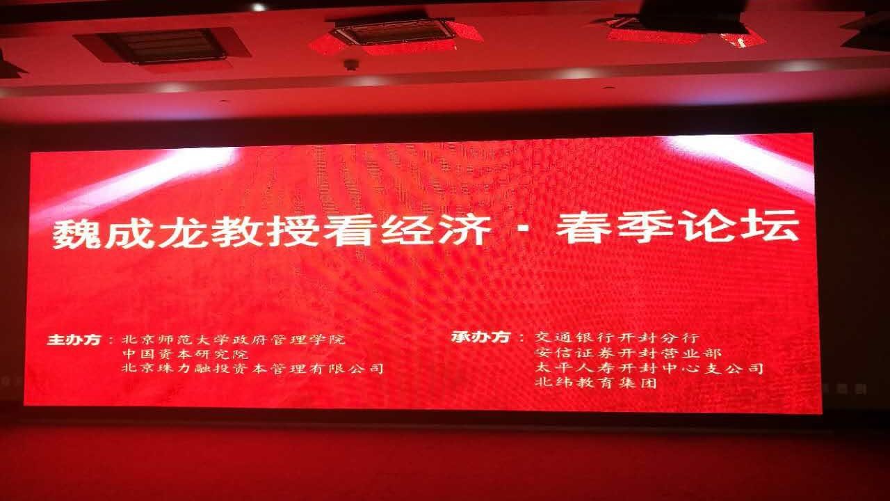 2017年3月19日上午,公司“魏成龙教授看经济”春季论坛在河南开封中州国际饭店举行。开封市政府金融办主任荆毅民、开封市银行业协会专职副会长郭福禄、开封交通银行开封分行行长曾庆辉与众多应邀嘉宾参加了论坛。魏成龙教授作为主讲嘉宾出席了本次论坛。